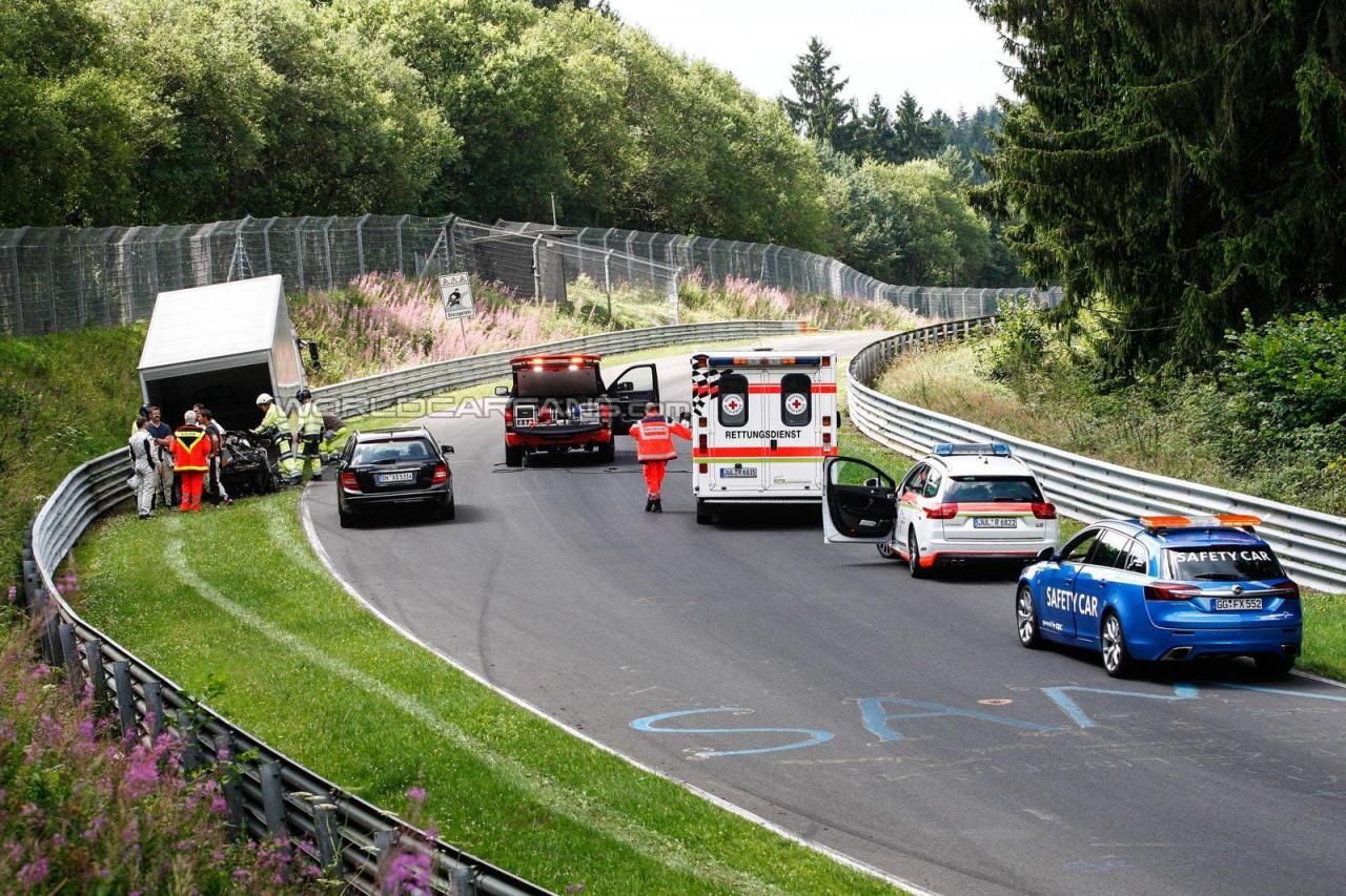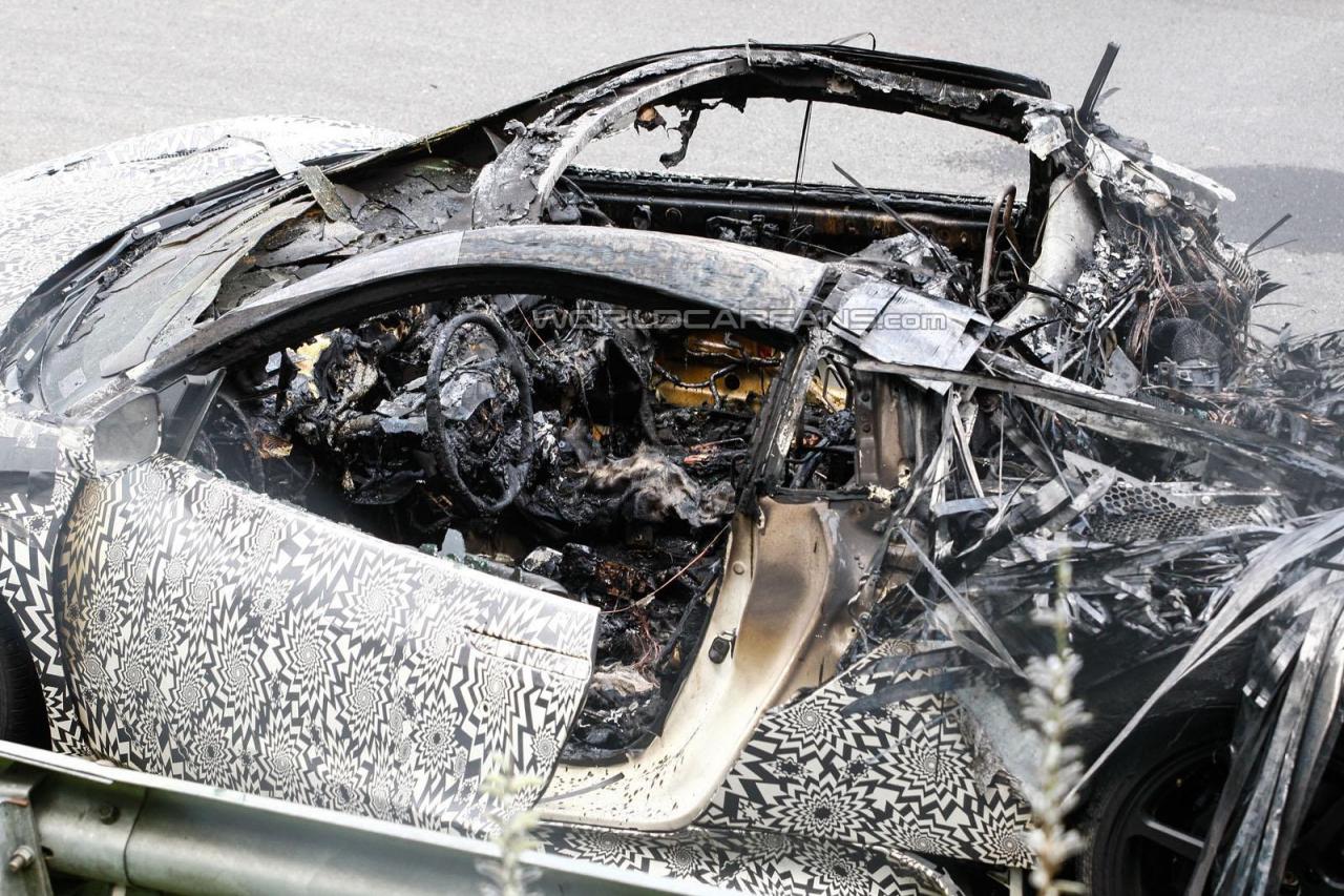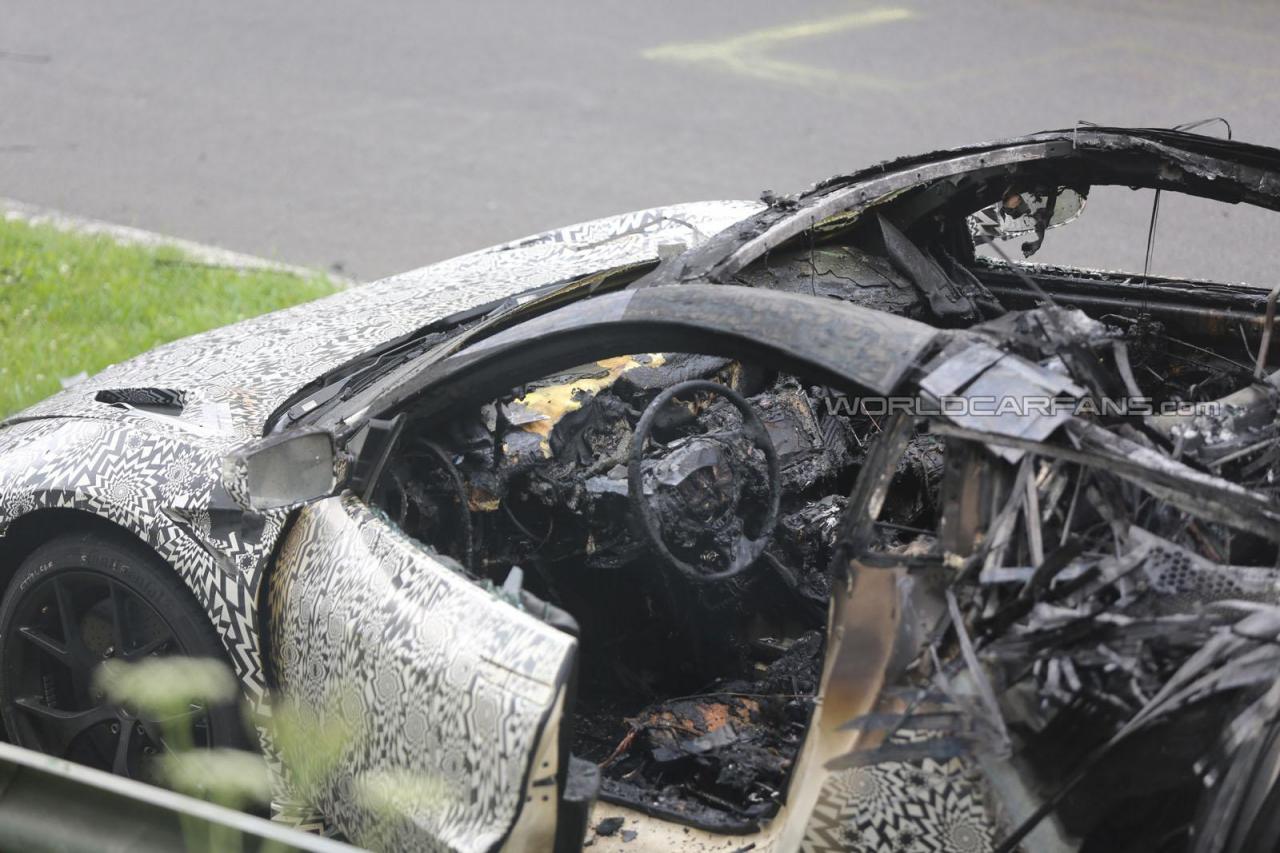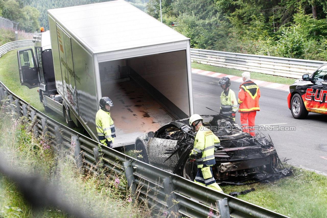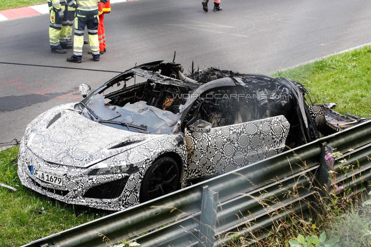 The 2015 Acura NSX recently commenced testing at the Nurburgring, and today a prototype has been already destroyed by fire. Details on the exact cause of fire aren’t known yet. The car was on its usual test run when when witnesses started to see flames coming out of the rear end. The test driver eventually pulled over at the Pflanzgarten and escaped without injury. The fire quickly spread and engulfed the whole car making it a total loss.