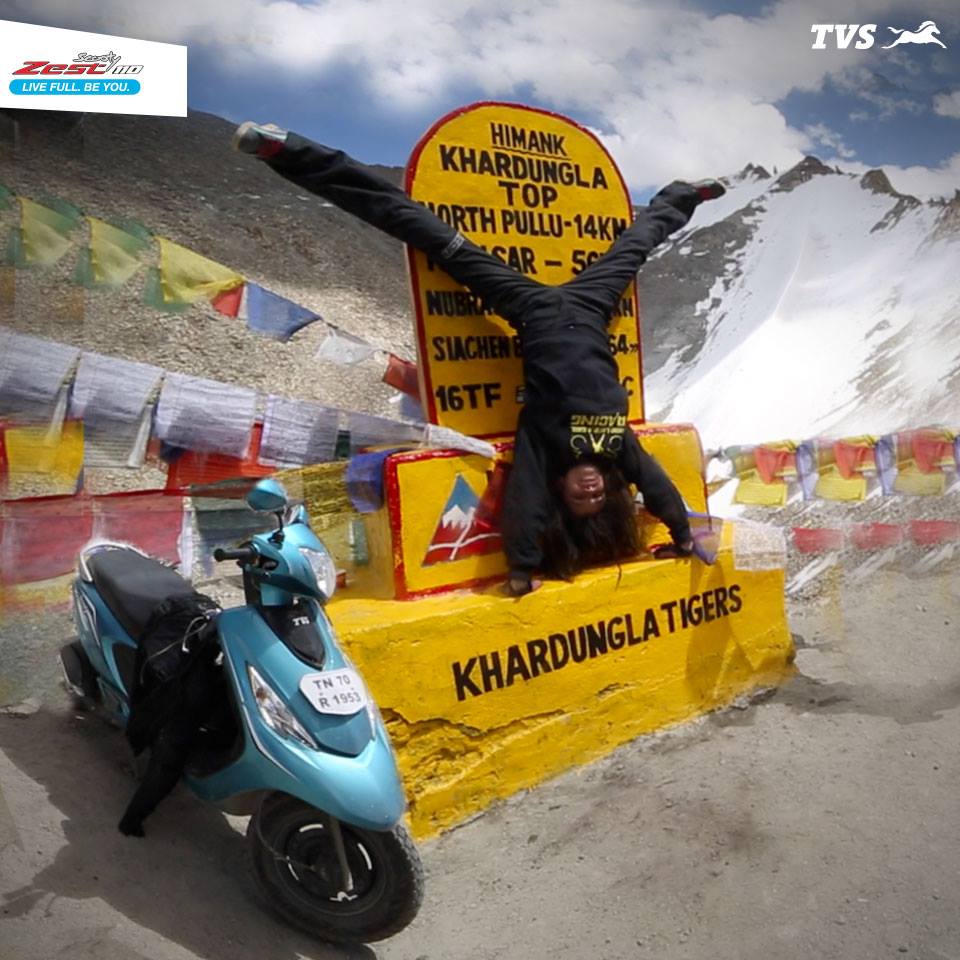 Although the ride was short, at only 50Km, it took Anam some time to cover the distance. The low oxygen took its toll and Anam had to summon her auxiliary will power to march forth. No such troubles for the TVS Scooty Zest 110 though, as the nippy 110cc motor powered the steel willed woman to her destination. Once at the summit, Anam’s face glowed with a smile, where she performed a handstand in front of the Khardung La board – just as she had promised herself.