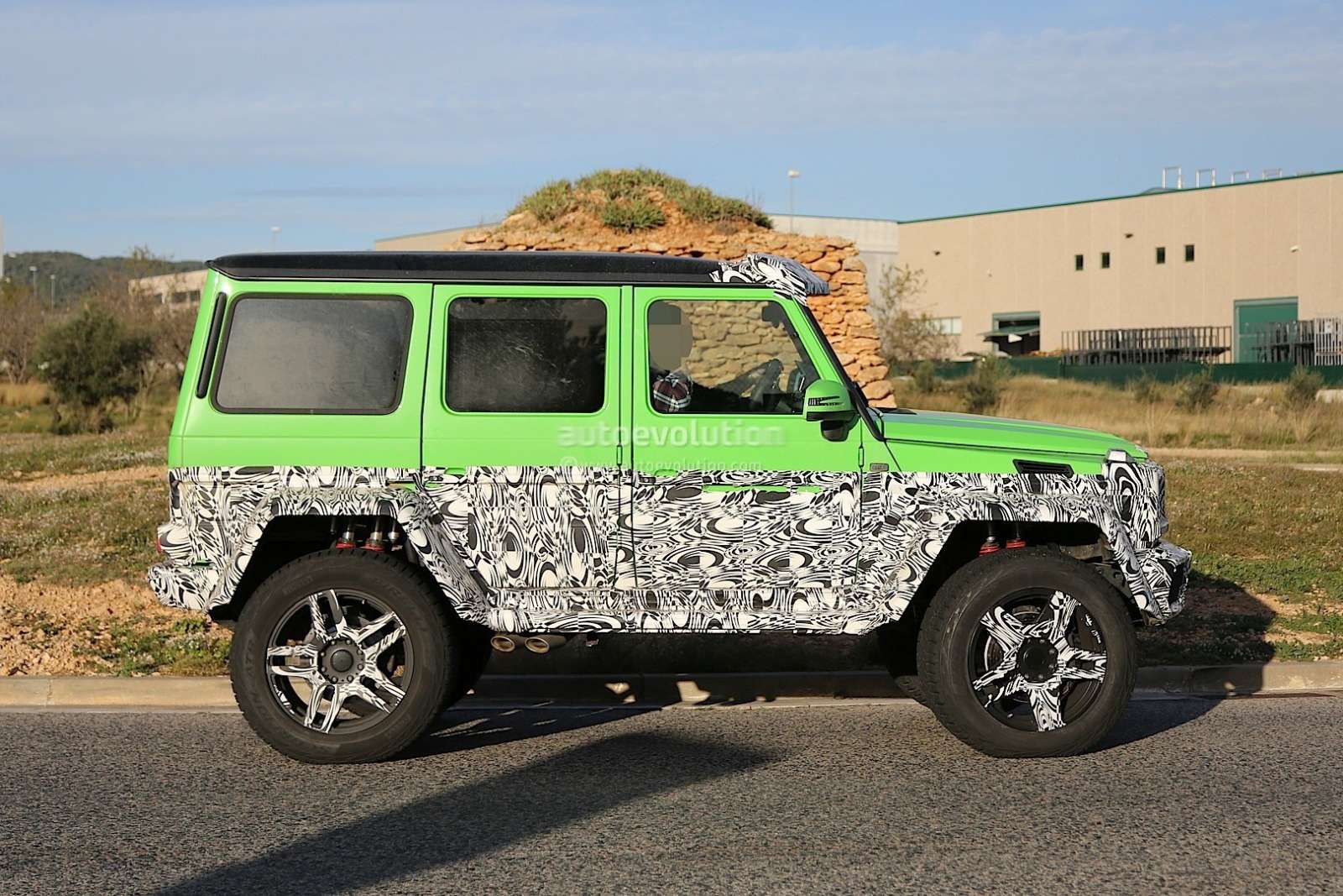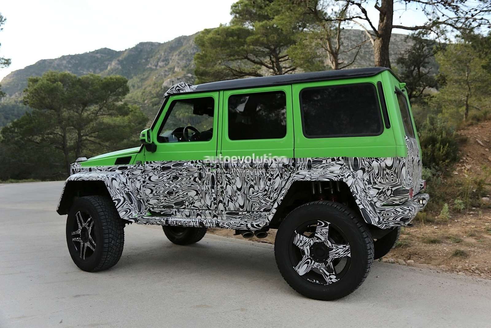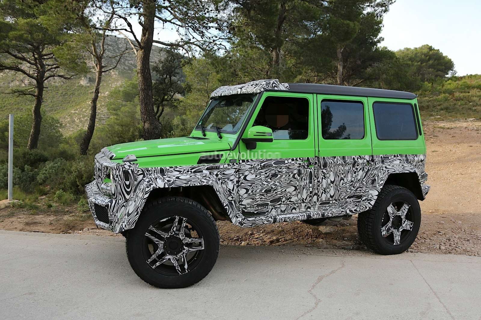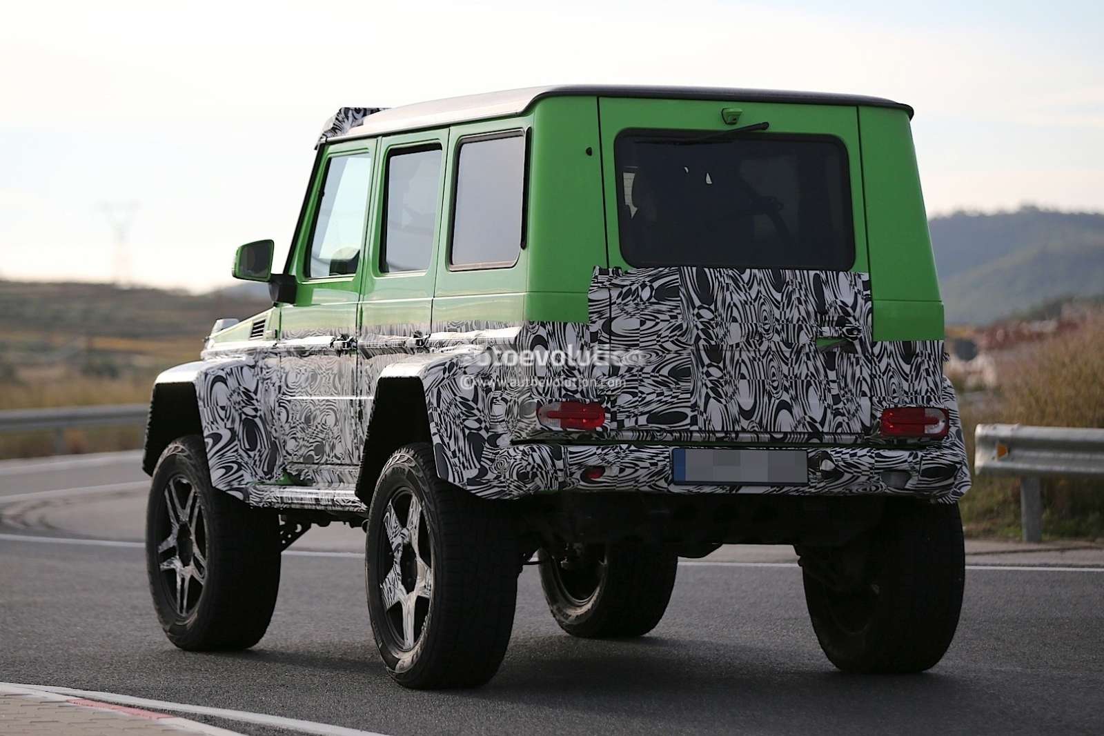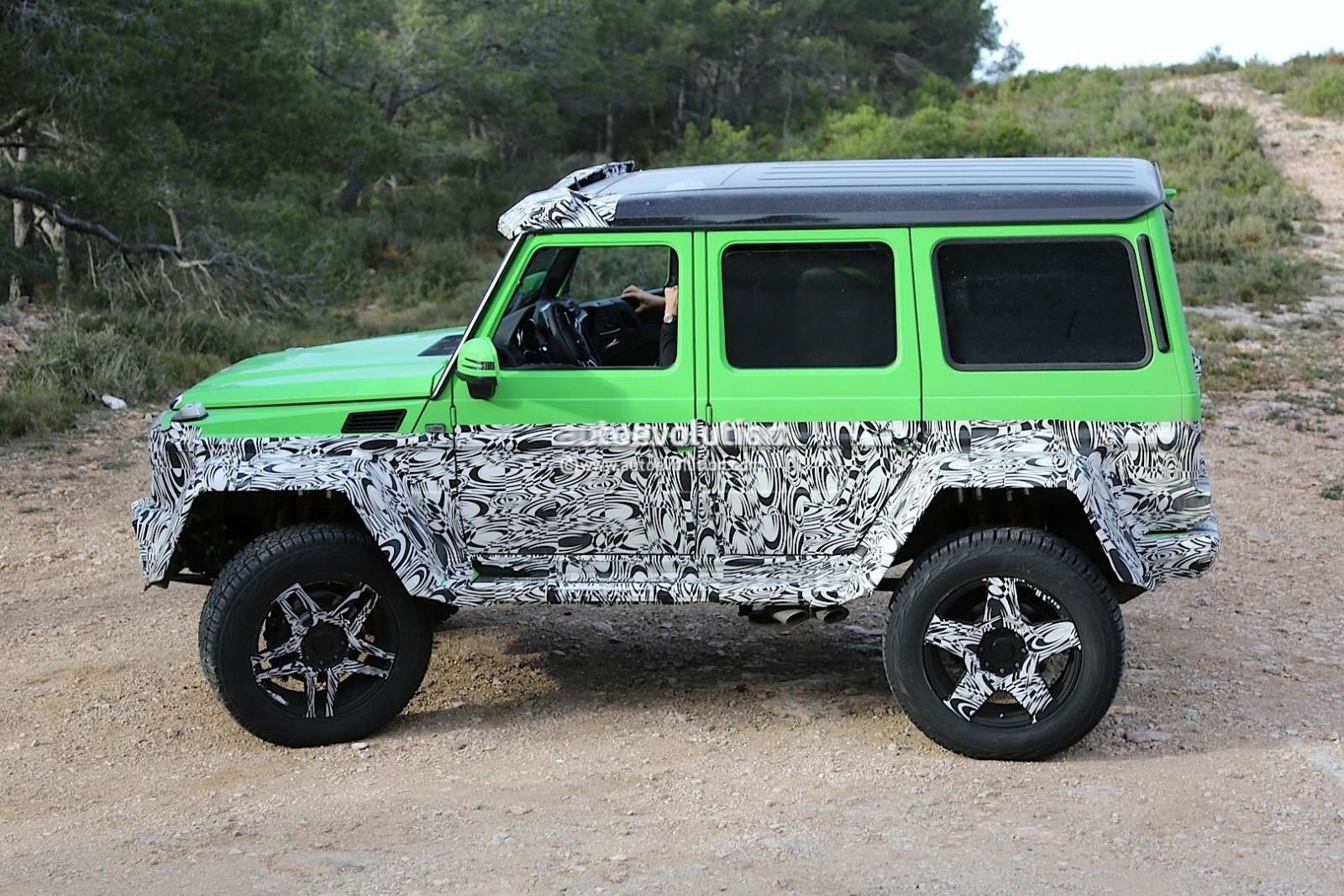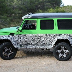 From the looks of it, the new Mercedes Benz G63 4X4 will be able to do perform all the land flattening antics of it’s 6X6 counterpart, like wading through a meter of water. The ground clearance will be lesser for the G63 AMG 4×4 though, and don’t expect the monstrous 37-inch tires of the 6×6 model here. The alloys will be all-new as well, while that lime green paintwork looks pretty distinctive for this monstrous Gelandewagen.