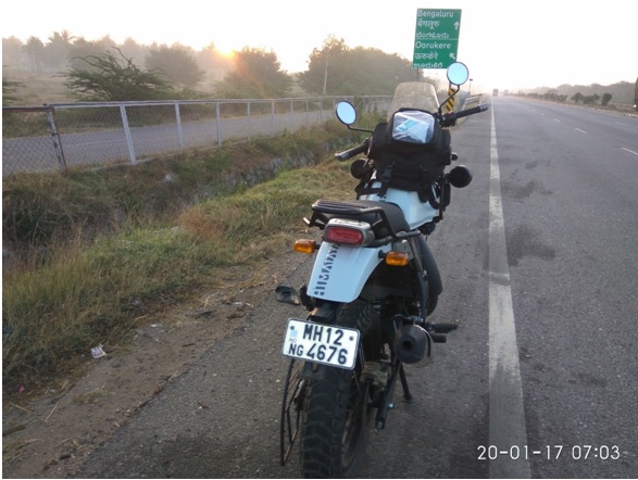 Taking regular petrol breaks, I manged to enter outskirts of Bangalore at around 7.00 AM. By now I had covered 600 km from Kolhapur to Bangalore. The weather was cold which made it tough to ride. In an urge to avoid the infamous Bangalore traffic, I wanted to get on to the Nandi Infrastructure Corridor Enterprises (NICE) road as early as possible. But fate had other decision to make and I was badly stuck in traffic near NICE road.