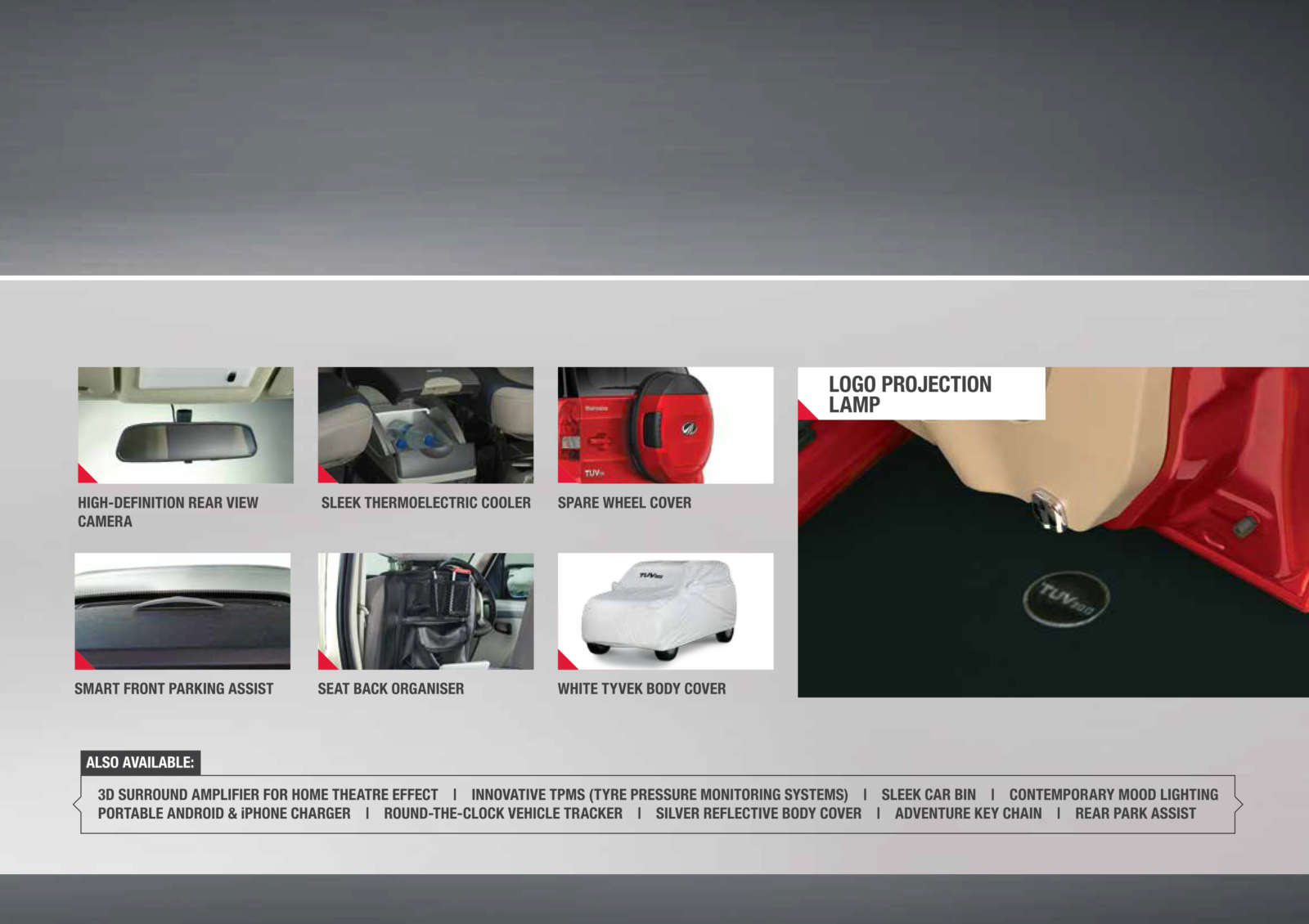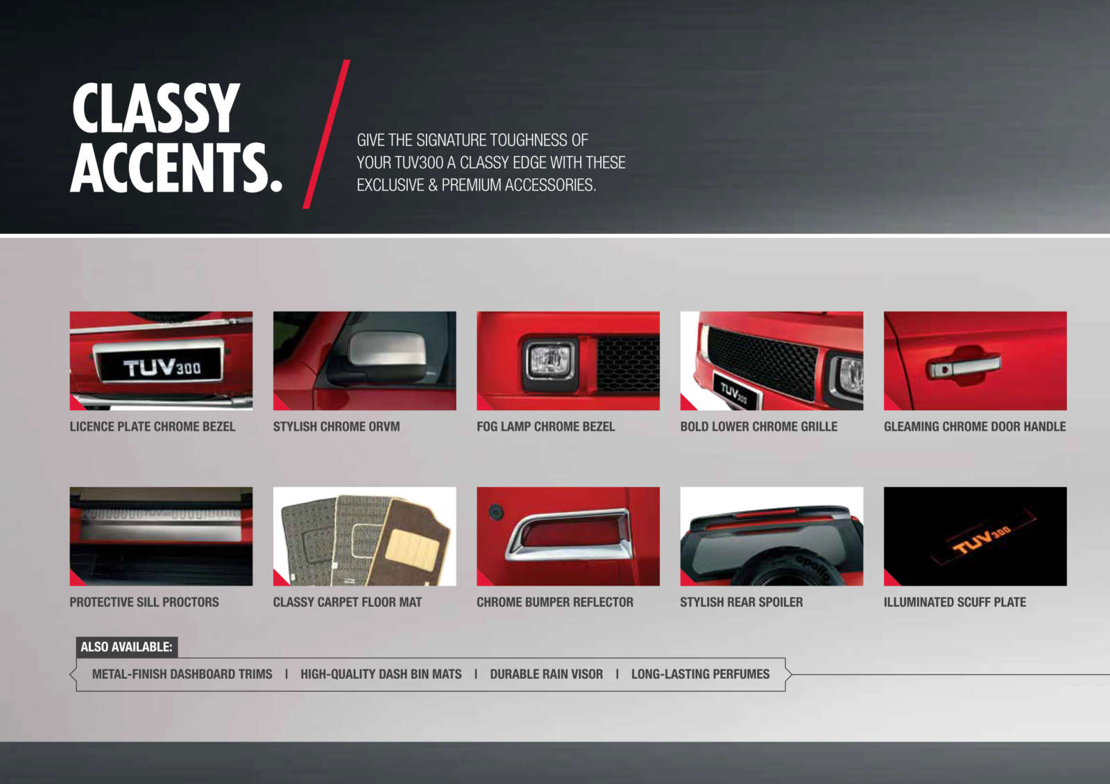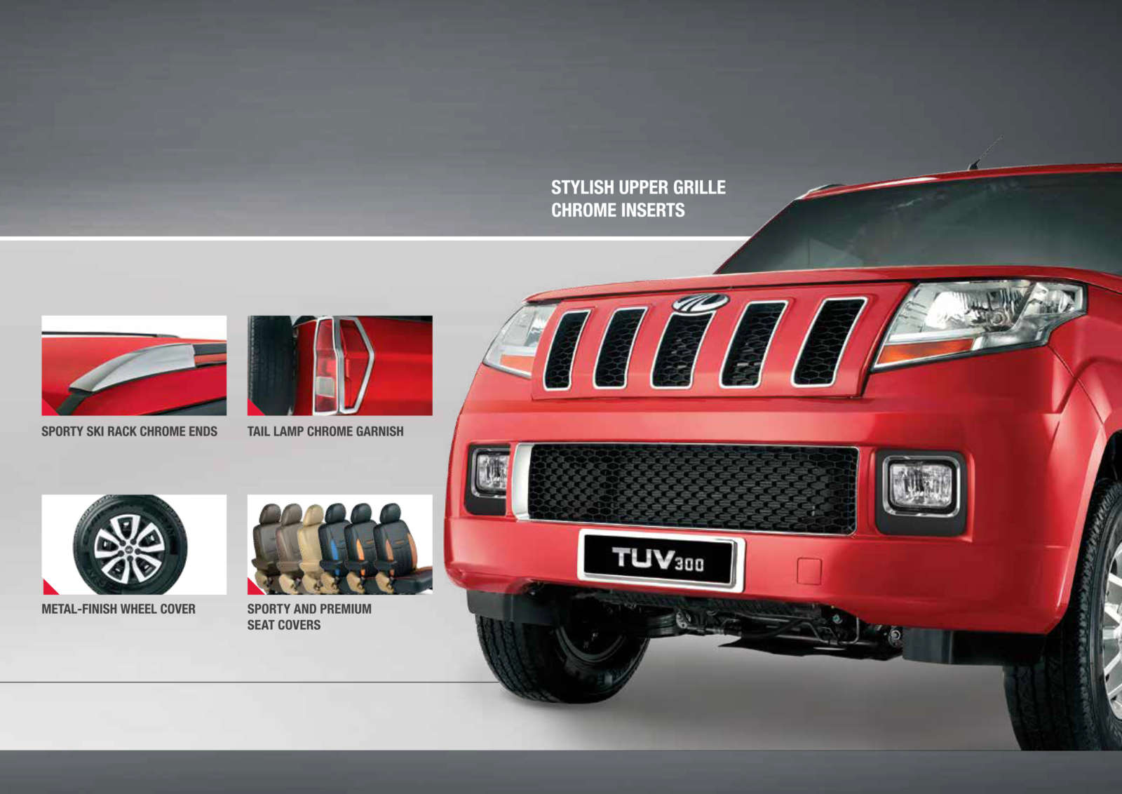 Furthermore, Mahindra Genuine Accessories will add shine to your TUV300 with chrome accents all over the body, including the grille, bumpers, door handles and the ORVMs. Also on the offing are luggage and bicycle racks, side steps and new alloy wheels. The interiors can be customized with a myriad of options, which range from different dashboard trims to a fancier infotainment system, and everything in between. Have a look at the TUV300 Accessories brochure below:
