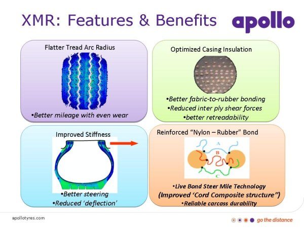 Apollo has introduced a new Steer Axle tyre ‘XMR’ in cross ply construction, which is designed for superior mileage and structural durability to deliver best cost of ownership in terms of ‘Total Mileage’; and the total mileage is derived from Initial Tread Mileage (ITM) and Retreaded Tyre Mileage (RTM).