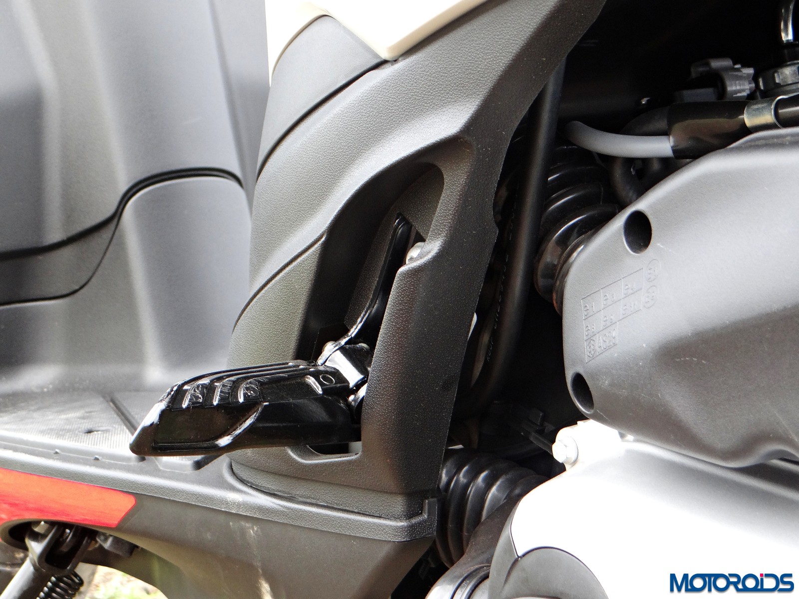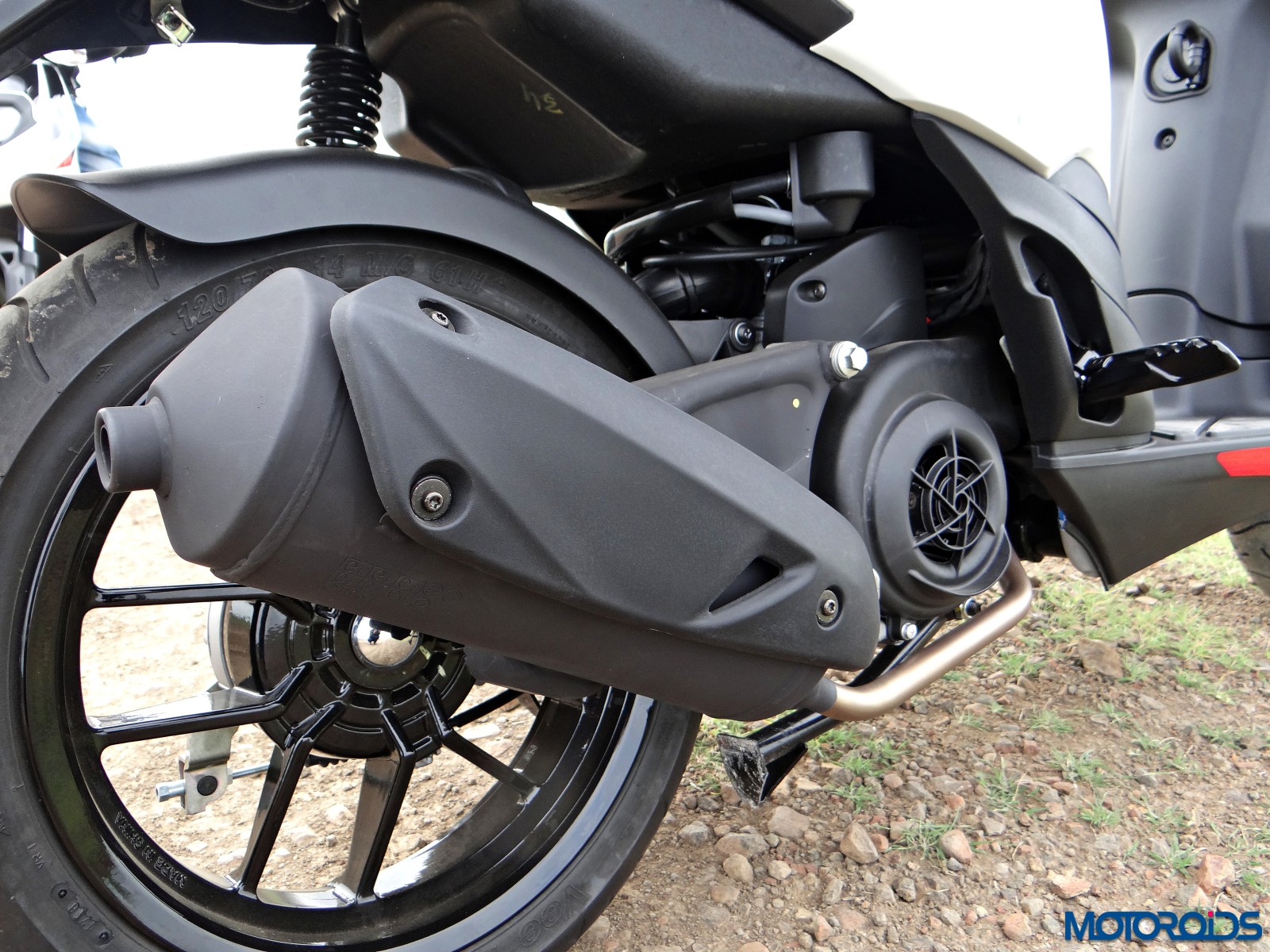 Those lightweighht 10-spoke 14-inch wheels strapped with Vee rubber look awesome. The suspension is set on the stiffer side which aids the scooter’s handling characteristics