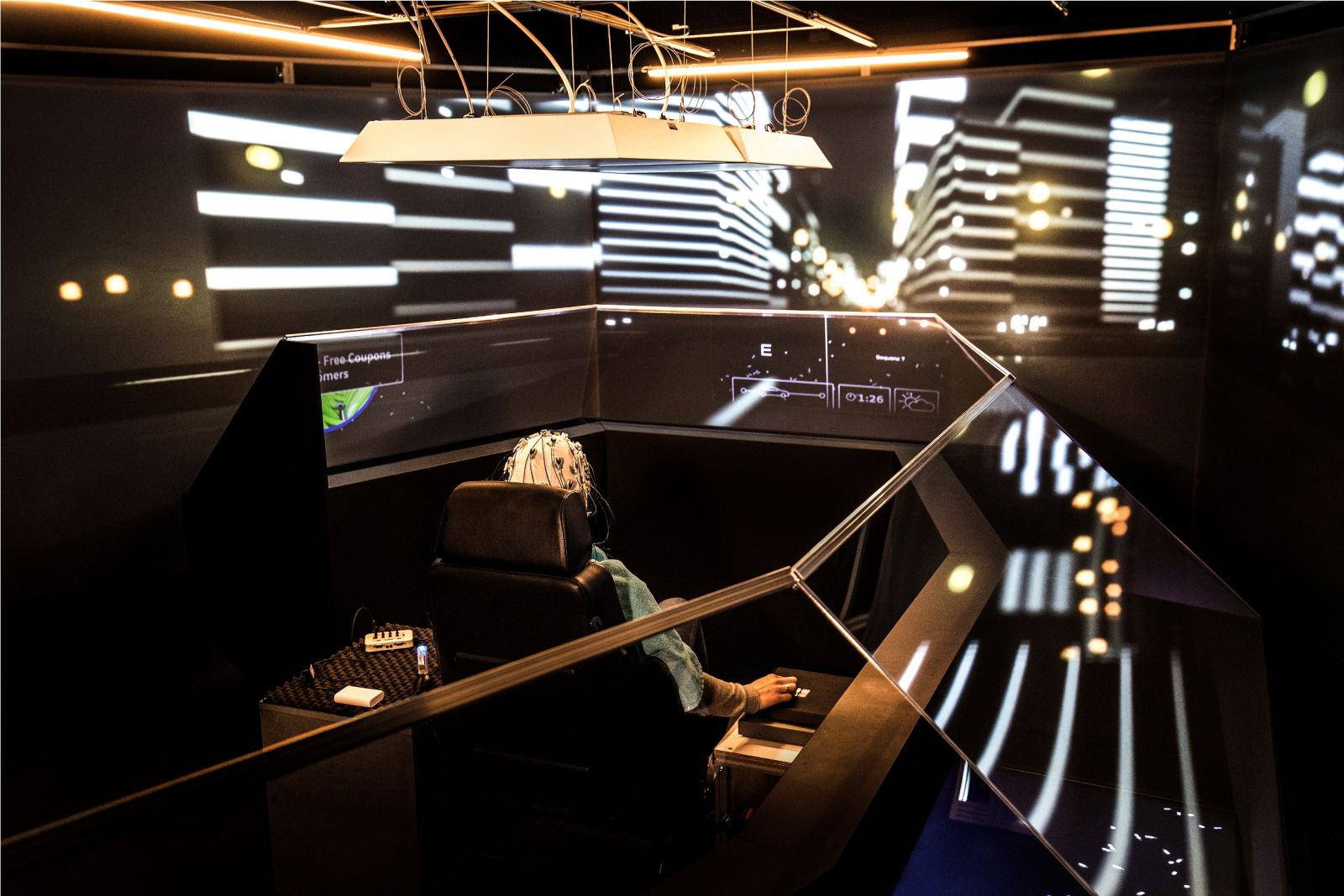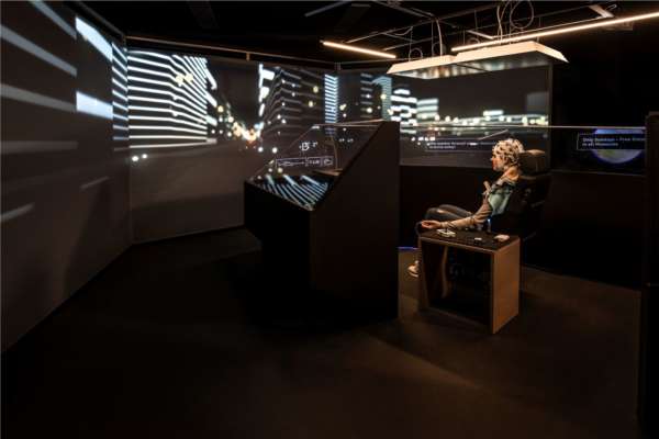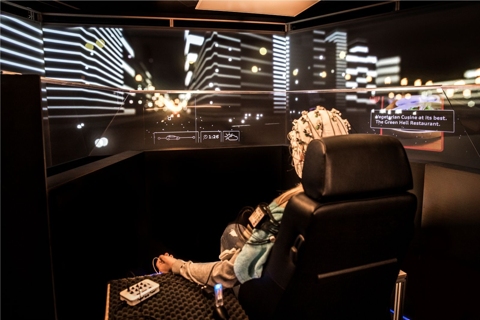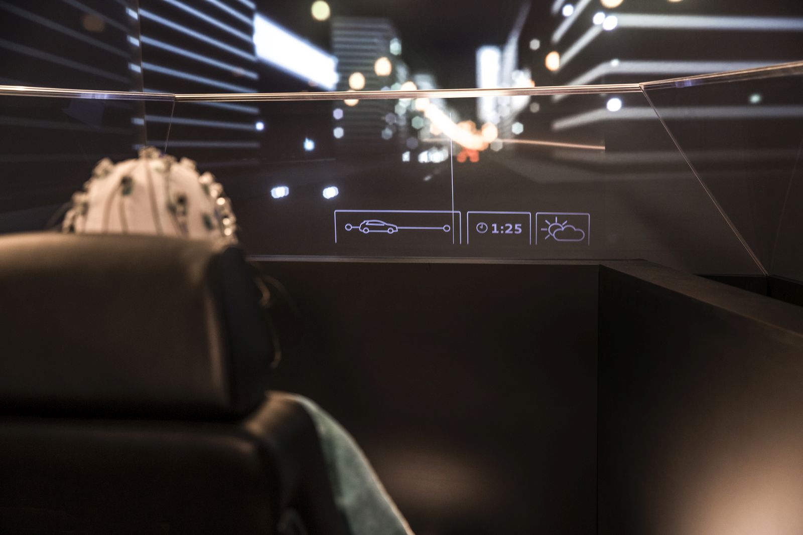 Audi has specially built a driving simulator that reproduces the situation of automated driving: with a variable interior and without a steering wheel. Large-scale projections convey the impression of a city drive by night. Via displays, the researchers can introduce digital distractions, the windows can be dimmed, and the color of the lighting and noise background change.