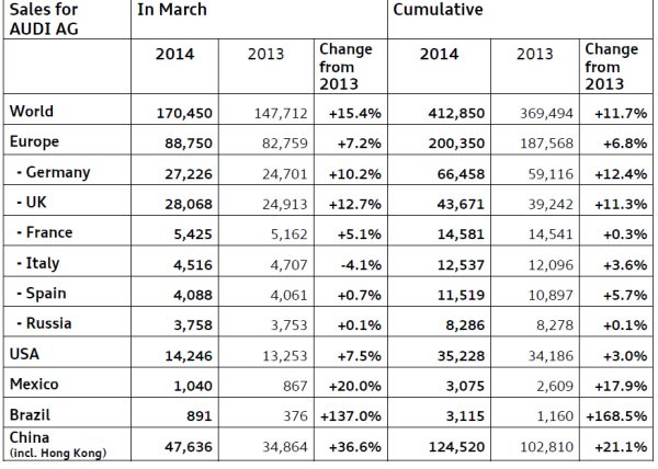 In Europe, Audi concluded March with an increase of 7.2 percent across all models to around 88,750 cars sold. In addition to renewed high growth in Germany (+10.2% to 27,226 cars), the two largest European export markets in particular provided a further boost: 28,068 units were delivered in the United Kingdom, a 12.7 percent year-on-year increase; the 5,425 cars sold in France represent a 5.1 percent increase. As the region’s leading premium brand, Audi sales in Europe thus totaled around 200,350 cars for the quarter, 6.8 percent more than one year ago.