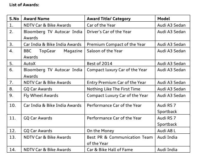 “Audi’s brand essence ‘Vorsprung durch Technik’ is evident in every award that we win. After the appreciation and tremendous response of our customers, being chosen by eminent juries from prestigious media houses for such highly coveted awards validates our faith that the World Car of the Year – Audi A3 Sedan is the right car at the right time for India. Audi continues to be the undisputed No.1 in the luxury car market. The sheer acceptance of our brand in this country is tremendous. The strategy that we have implemented in this journey has helped us to not only achieve leadership but also to maintain it,” said Mr. Joe King, Head, Audi India.