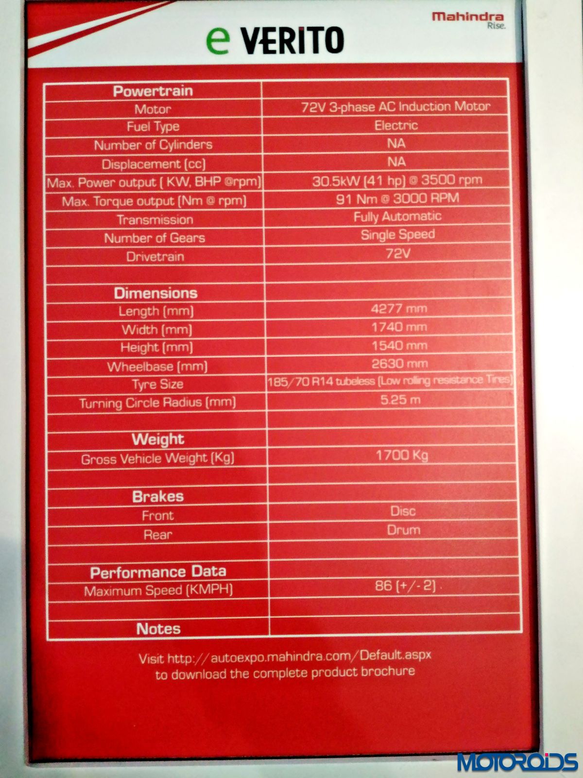 Mechanical details include a 72V 3-Phase AC induction motor that delivers 30.5 kW or 41 hp of power at 3500 rpm and 91 Nm of torque at 3000 rpm. The E-Verito can reach a top speed of 86 kph. The E-Verito also gets an ECO drive mode and remote diagnostics which include real time and immediate assistance. The gross weight of the vehicle stands at 1700 kg. Braking duties are performed by a disc brake upfront and drum brakes at the rear.