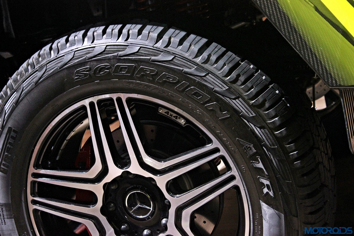 Permanent all-wheel drive, an off-road reduction in the transfer case, three lockable differentials, 450 mm of ground clearance, along with the aforementioned portal axles ensure that the G 500 4×4² can ford through a meter of standing water. The 4.0 litre, V8, bi-turbo heart makes 422 hp, which, along with 450 lb-ft of torque is put to the ground using a set of massive 325/55 R 22-sized tires wrapped around 22-inch wheels.