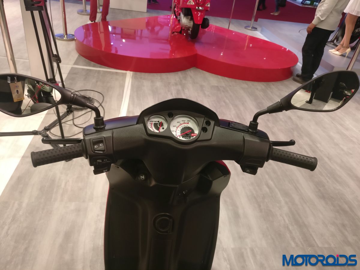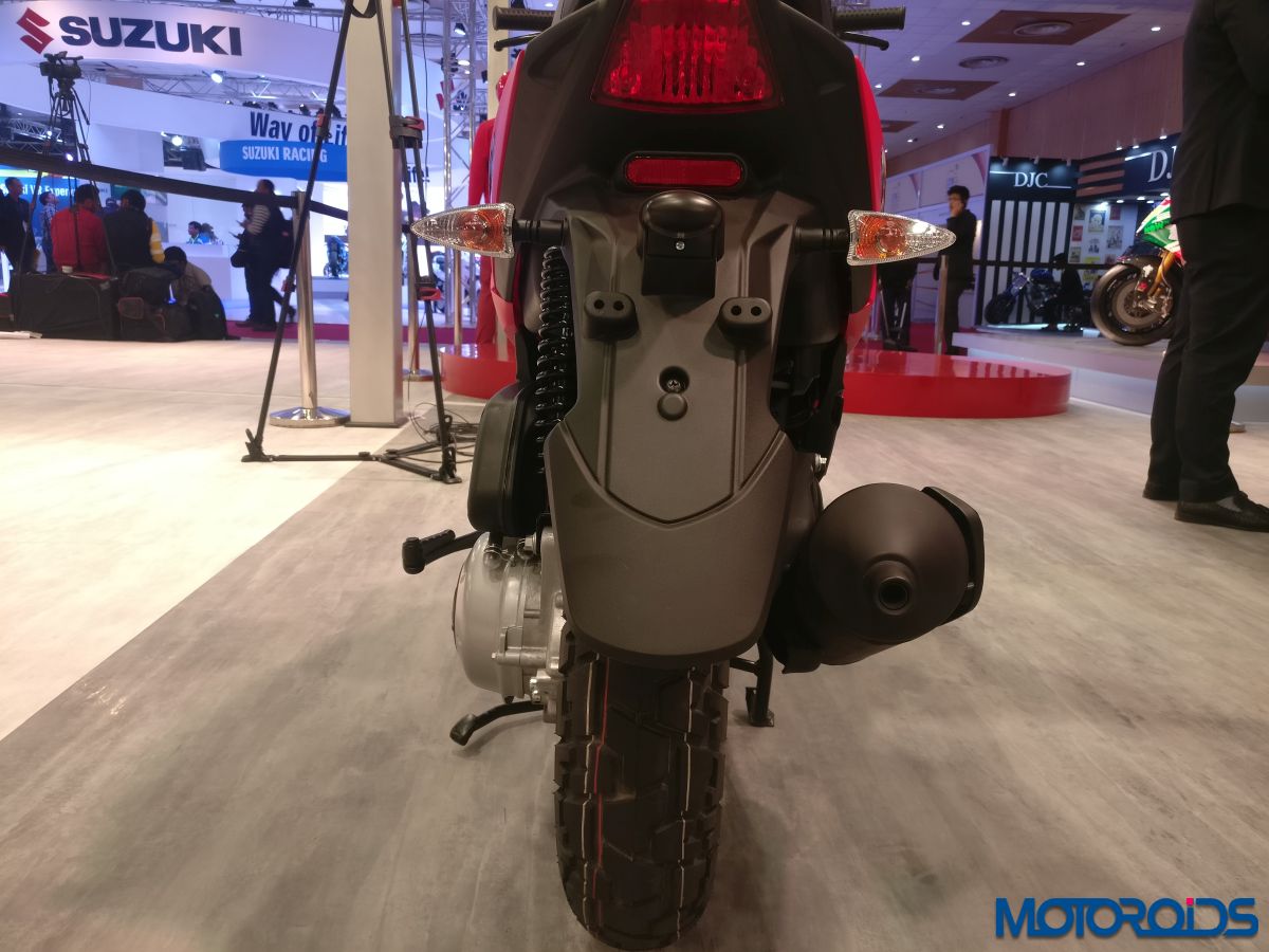 The scooter features a new matt red colour scheme with spunky black graphics all around. The front sees a black shroud for the integrated headlamp. The most apparent change, however, comes in the form of the front tyres. These are smaller 12-inch alloys that are shod with wide high profile terrain tyres. This gives the scooter a rugged stance.