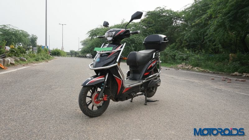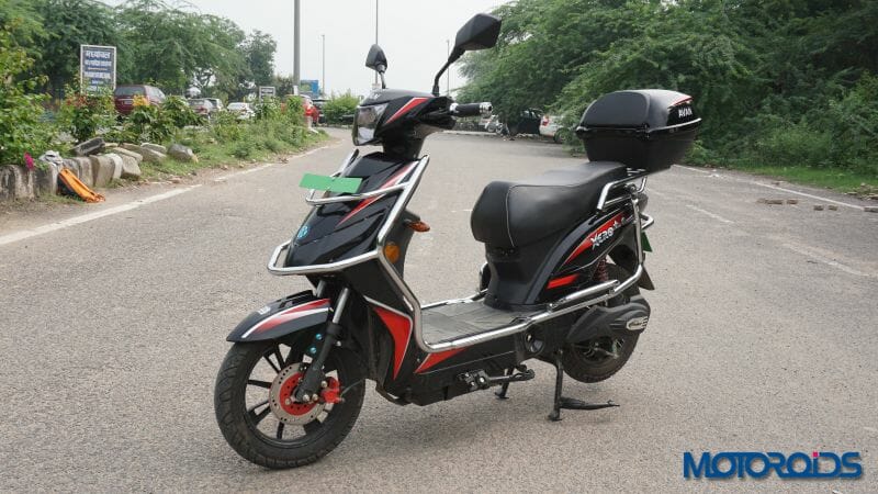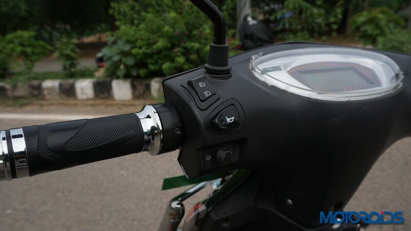 Among all the electric scooters we have ridden so far, this felt the smallest and most compact. It’s exoskeleton-ish chrome frame tries to hide the compactness of the scooter but it doesn’t help. The design is typical of any other scooter with handle mounted LED headlamp, a clean front apron which has a black insert breaking the monotony. The LED indicators are mounted behind the apron and get almost lost. As electric scooters get more and more design heavy, the XERO+ does not try too hard. However, it’s chrome frame does make it stand out. The rear mounted box which comes as a standard does provide some uniqueness to the Xero+. Tail lamps get lost below the utility box.