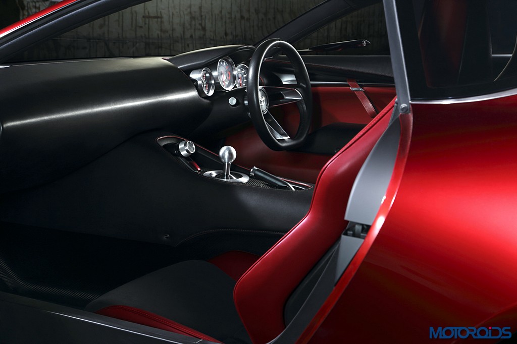 The interiors are classic sports car fare, with none of that fake carbon fibre infested fuss that modern sports car put to the table. Minimalism is the word that gets whispered around the RX-Vision’s cabin. The dashboard breeds nothingness, while the functional elements like the steering wheel, pedals and instrument cluster are just highlighted by a metallic hue. That spherical shifter is so retro, and so is the red and black leather trimming.