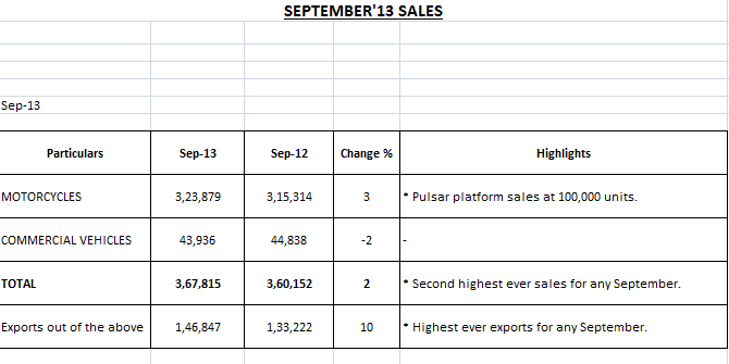 Indian motorcycle maker Bajaj Auto Ltd has announced that it registered a 2 percent growth in sales for September 2013. The bike maker sold 367,815 units in September this year, 2% more than 360,152 units sold in same month last year. Compared to Sept 2012, the bike maker sold 3 per cent more motorcycles and 2 percent lesser commercial vehicles in September 2013.