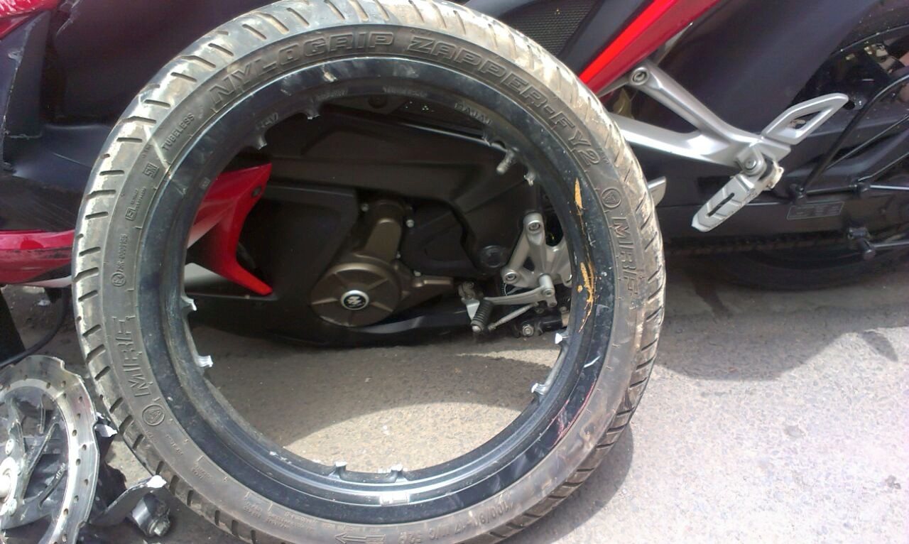 The state of the broken wheel, as visible in the images is quite surprising. The wheel doesn’t seem to have sustained any damage, so the theory of the spokes coming off during braking somewhat holds. However, the clean manner in which the spokes have come off is something we have never seen before. For all we know someone might just have sawed the spokes off the rim. We really don’t have any conclusive evidence here. Bajaj have sent a special team to the service station to figure what exactly was the cause of the incident and we will update you as soon as we get more details on the matter.