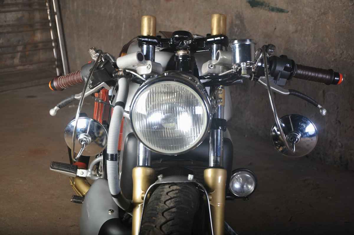 The chassis has been modified, and all body panels replaced for a unique look. Upfront is a Royal Enfield Continental GT sourced headlight in a custom casing for a stretched look. Behind the headlight is a pair of clip-on handlebar, again sourced from the Royal Enfield cafe racer. The front blinkers have been integrated into the handlebar. The complete list of modifications include: