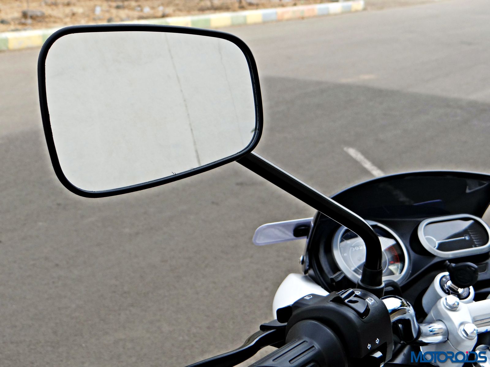 The Bajaj V15 is available in two colours – Ebony Black and Pearl White. Both motorcycles get identical graphics and the fit and finish levels are commendable, especially at that affordable price point. However, there are a few bits that bothered us. The plastic on the side panel, for example, had already showing signs of fade. The rear view mirrors offer a decent view of the traffic approaching from behind but the vibrations at speeds above 60 kph shake things up terribly for a clear visual.