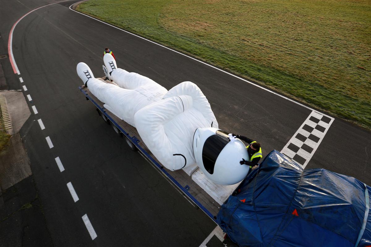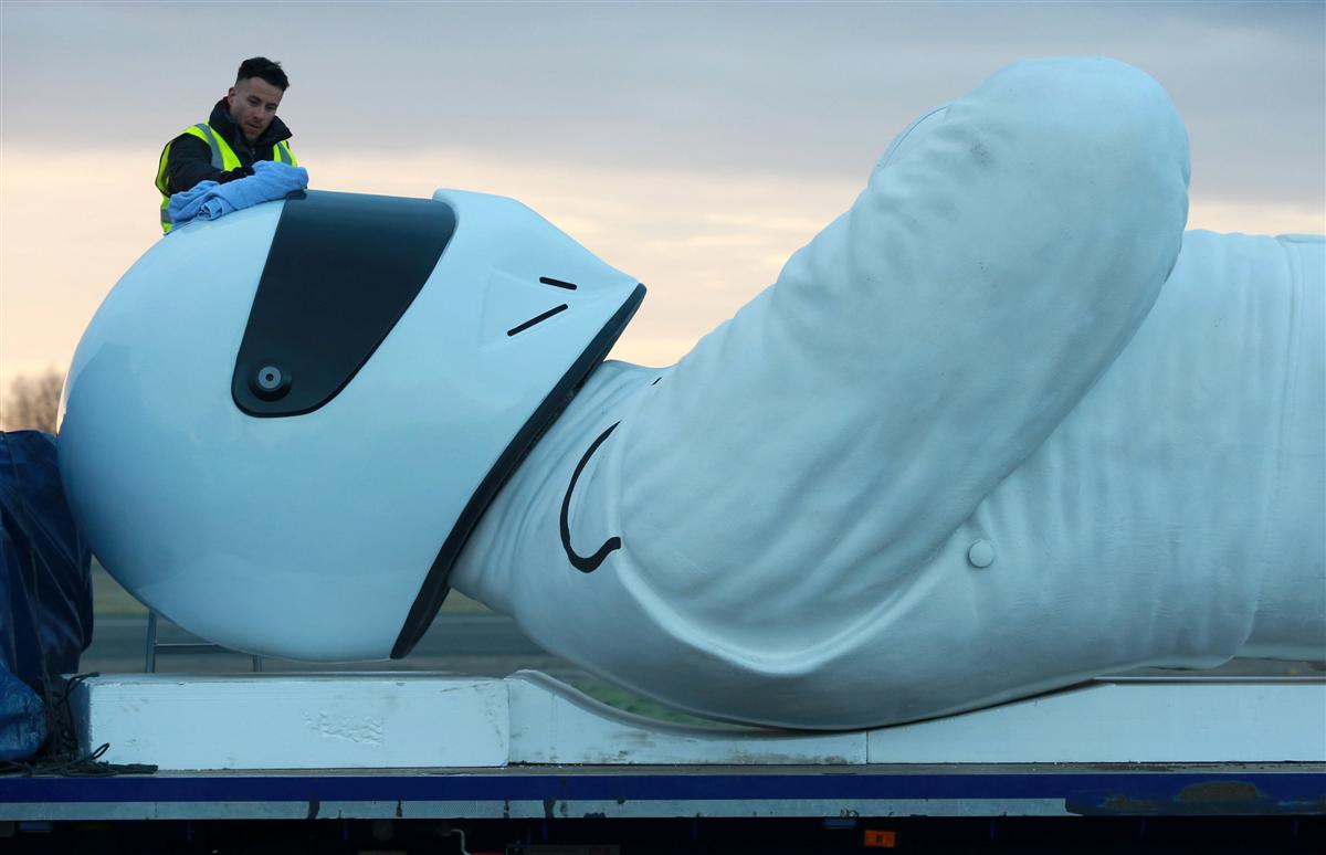 The statue constructed of fiberglass took three sculptors and over two months towards designing, construction and painting work. Proportions of the statue reads that the Stig’s head and torso measure 12 feet equivalent to the height of a double decker bus.