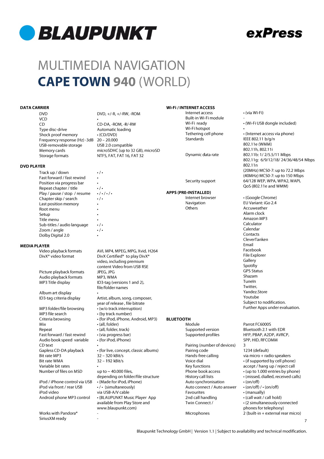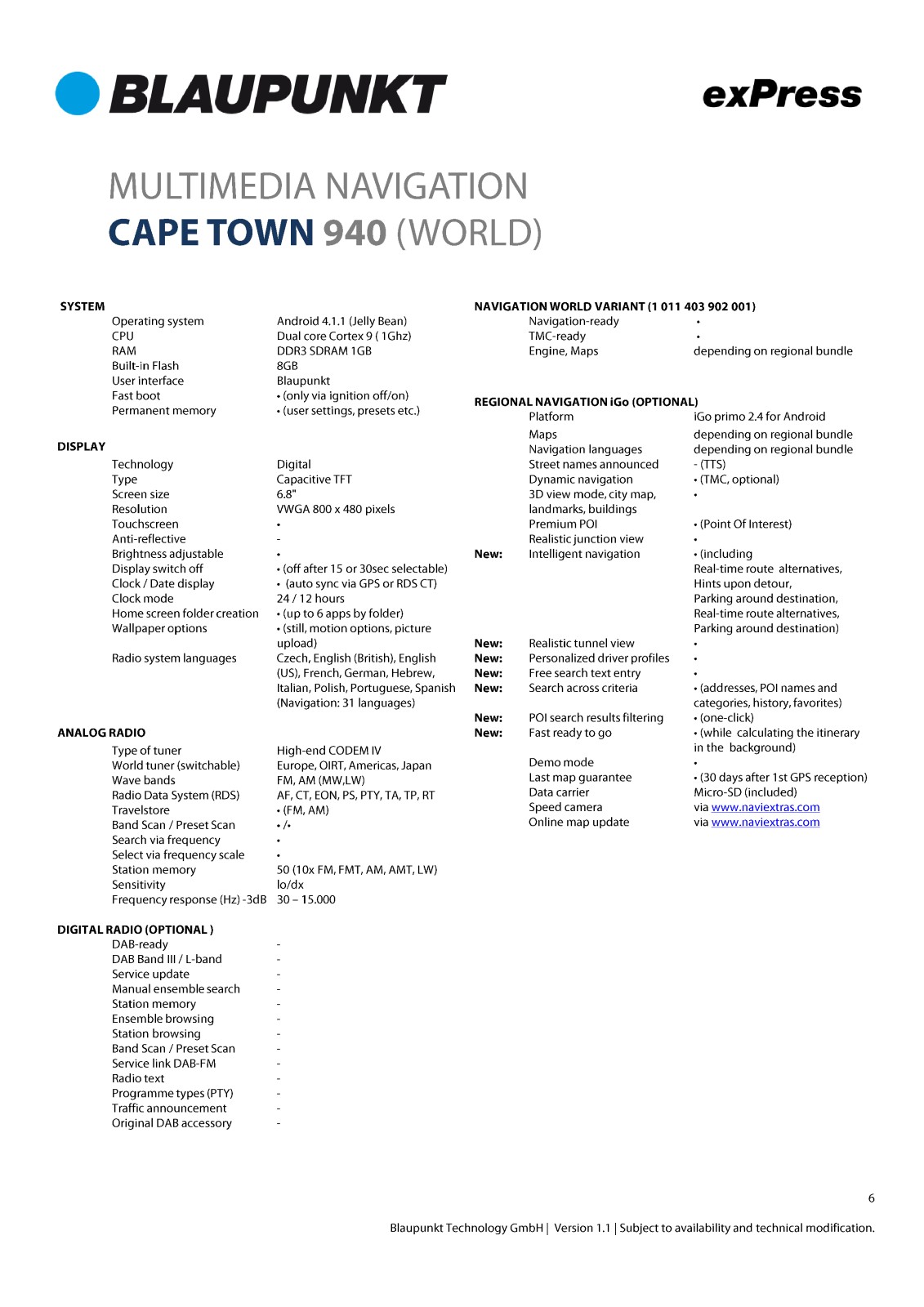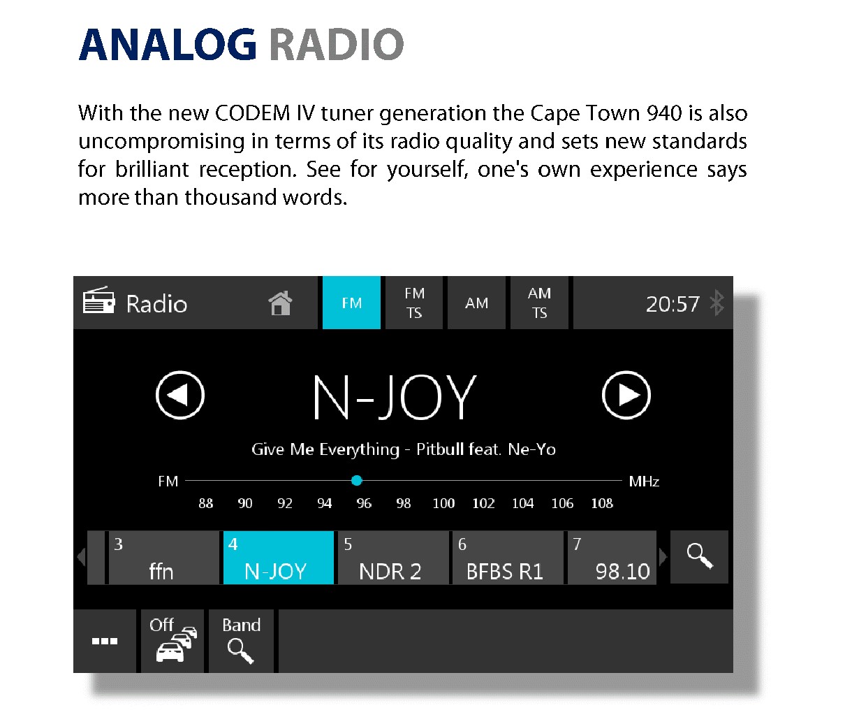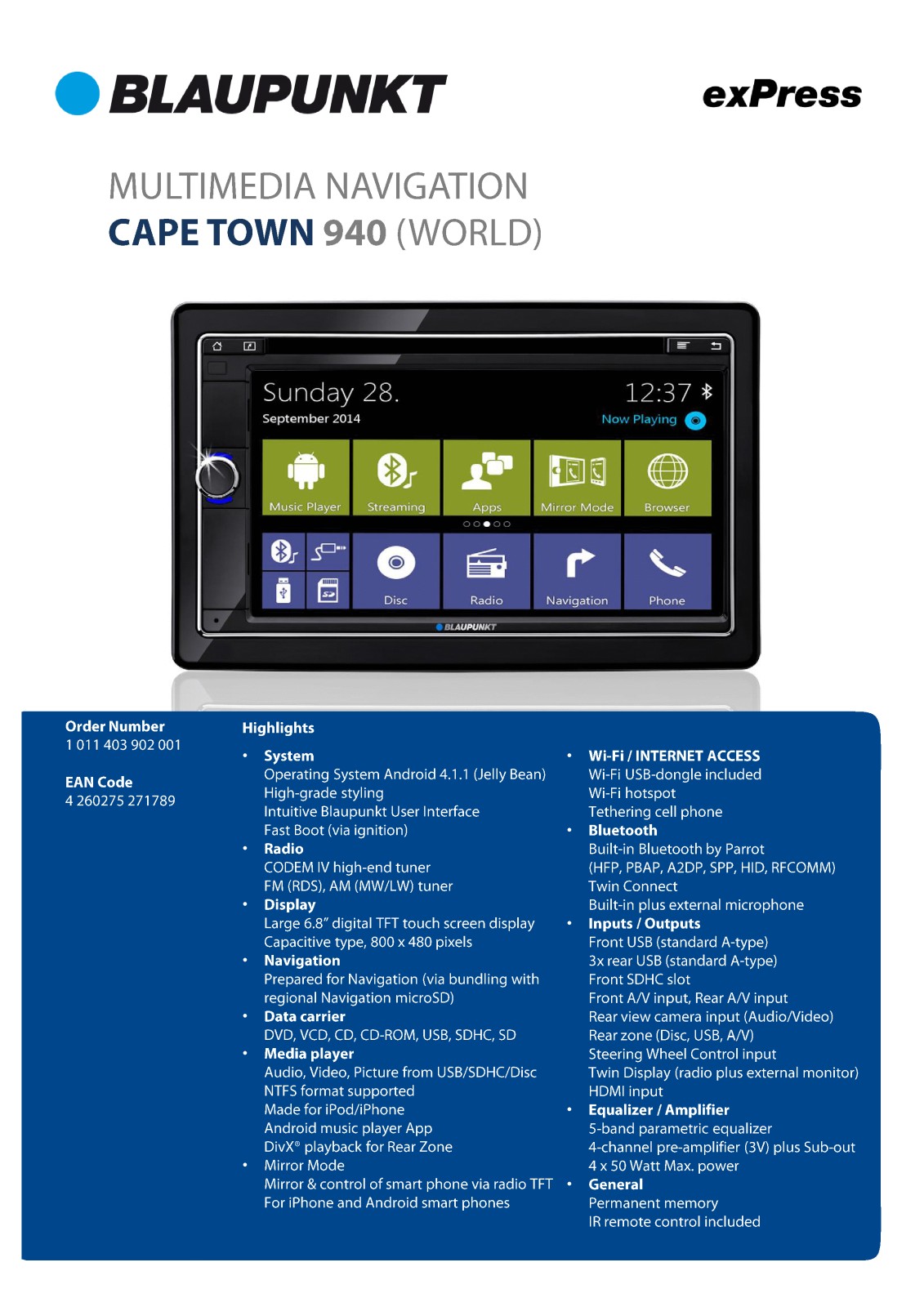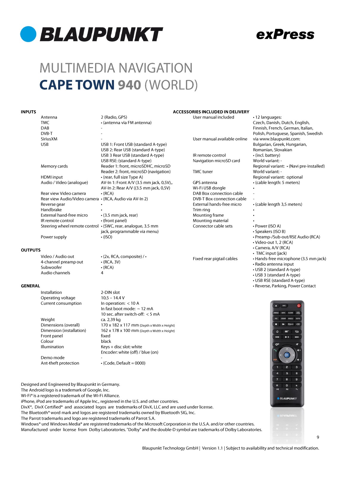 Blaupunkt has equipped the Cape Town 940 with the following: