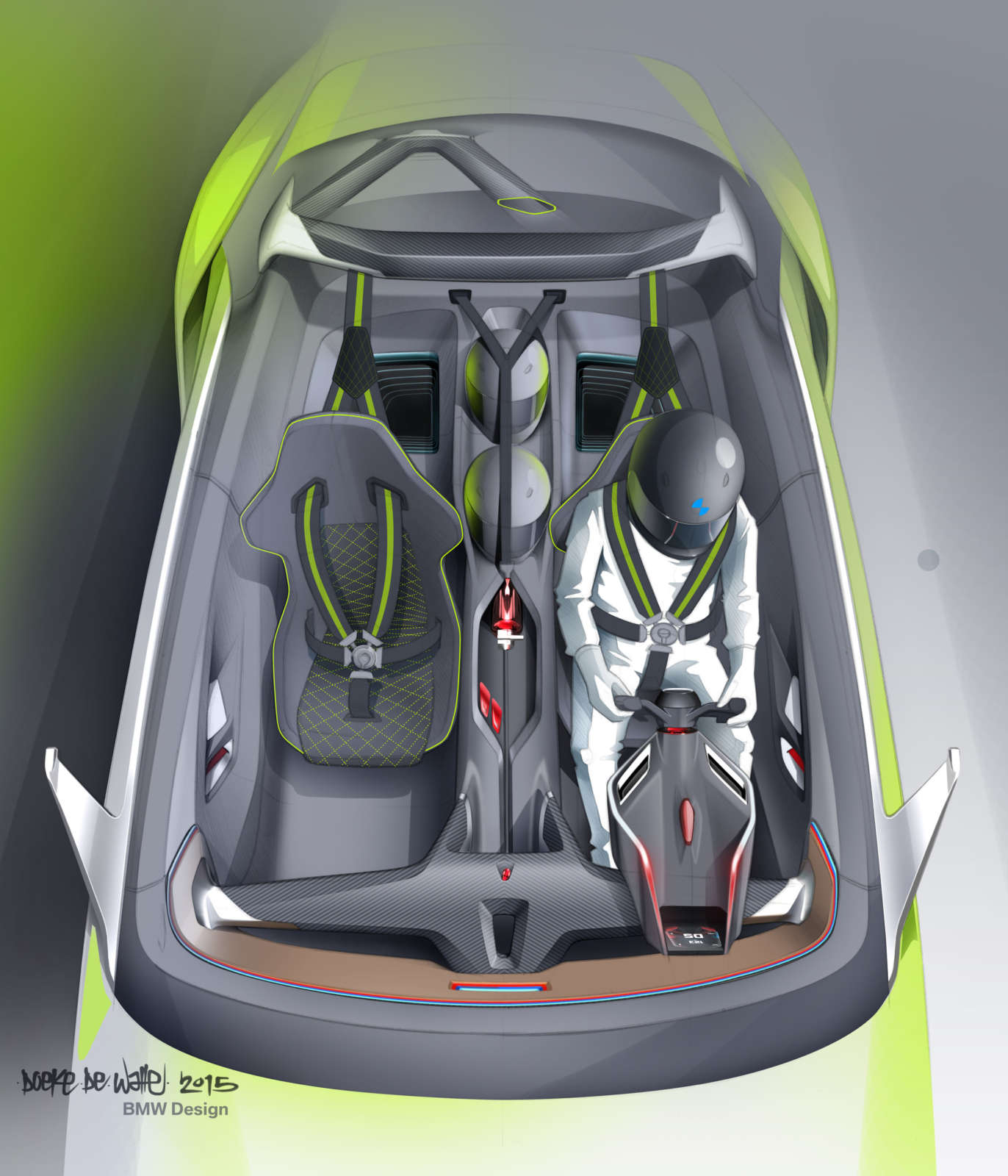 The only elements in the rear of the vehicle are two helmets integrated into the transmission tunnel. These are held in place by a belt when not in use. In the place of a rear seat bench, there are only covers for the eBoost energy accumulators.