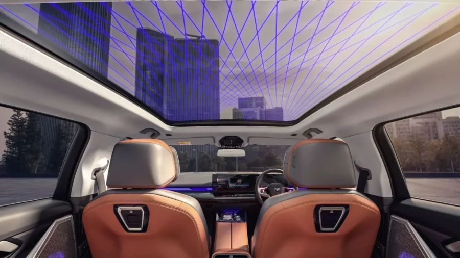 BMW uses a printed pattern on the glass and built-in LED light. It works along with ambient lighting in the car, along with colors depending on the driving mode. Even in daylight, one is able to see that the lighting lends the cabin an extra bit of premiumness.