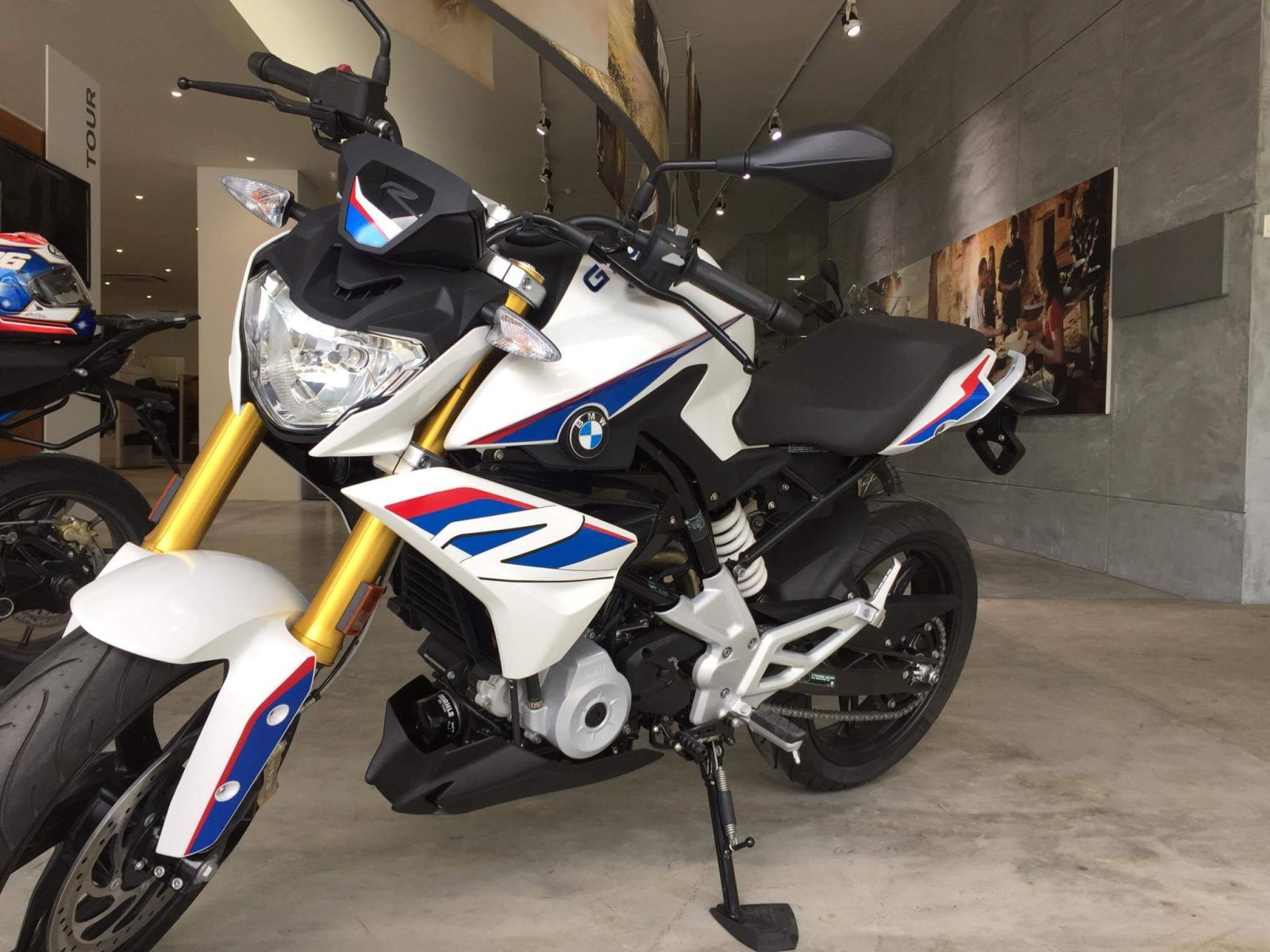 The G310R carries its visual DNA from the roadster family and looks stunning with its signature white, blue and red color theme.