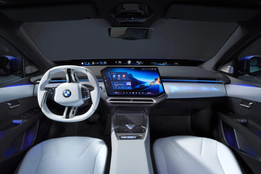 Inside, the cabin is fully new. A large 17.9 inch touchscreen sits in the centre. A long display strip called Panoramic Vision runs across the base of the windshield and shows driving and system data. There is also an optional 3D head-up display. The steering wheel is new with light up controls.