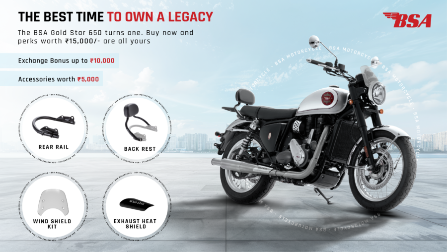BSA’s anniversary celebrations bring something special for riders. For the first time, the company is offering an exchange programme where customers can trade in any two-wheeler for benefits of up to ₹10,000. On top of that, every new Gold Star comes equipped with the Goldie-kit, a hand-picked accessory set worth ₹5,896. Together, these add up to a festive package worth ₹15,896.