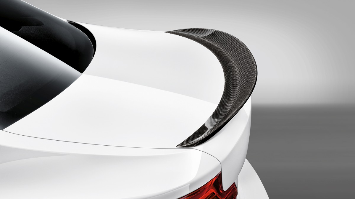 The compact sports coupé features large 19 inch light alloy wheels, fitted with 225/35 R19 (front) and 245/30 R19 (rear) mixed tyres. The double-spoke forged wheels are finished in bicolor Orbit Grey and have a diamond polished visible side. At the front, the special edition features areodynamics parts consisting of air guides, splitter and bumper front section, whose spoiler lip is finished in matt black. The radiator grille including kidney grille bars is also in black. The partly painted rear diffuser and a carbon-fibre rear spoiler add to the car’s expressive appeal. Here, too, carbon fibre and black colours create an impressive contrast to the car’s white paintwork.