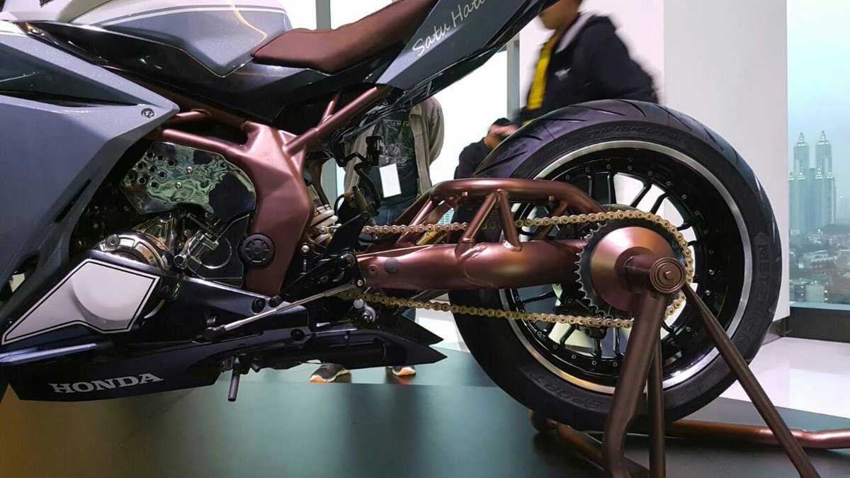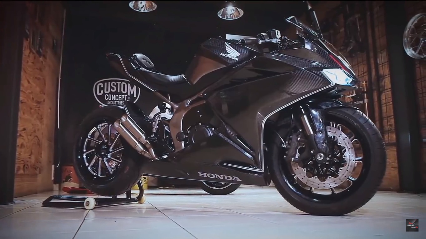 Yes, there were two customised motorcycles at the event in Indonesia and we were introduced to the carbon-fibre equipped version courtesy YouTube channel MZ Crazy Cars. Both the motorcycles were customised by Baru Motor Sports/Custom Concept Industries who were appointed by Astra Honda Motor for the job. This bad-ass, all black CBR250RR gets carbon-fibre treatment on the fairing, fuel tank extensions, fenders and rear panel. While this carbon-fibre equipped model also gets single sided swingarm, unlike the blue and white model, it isn’t a tubular unit. The carbon edition also misses on petal discs.