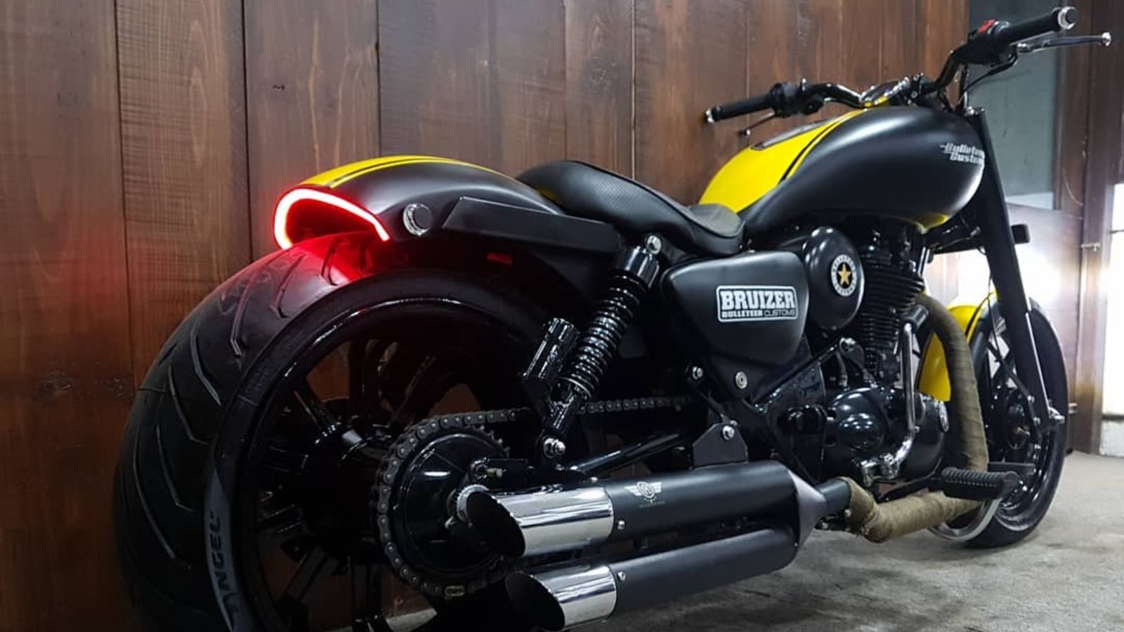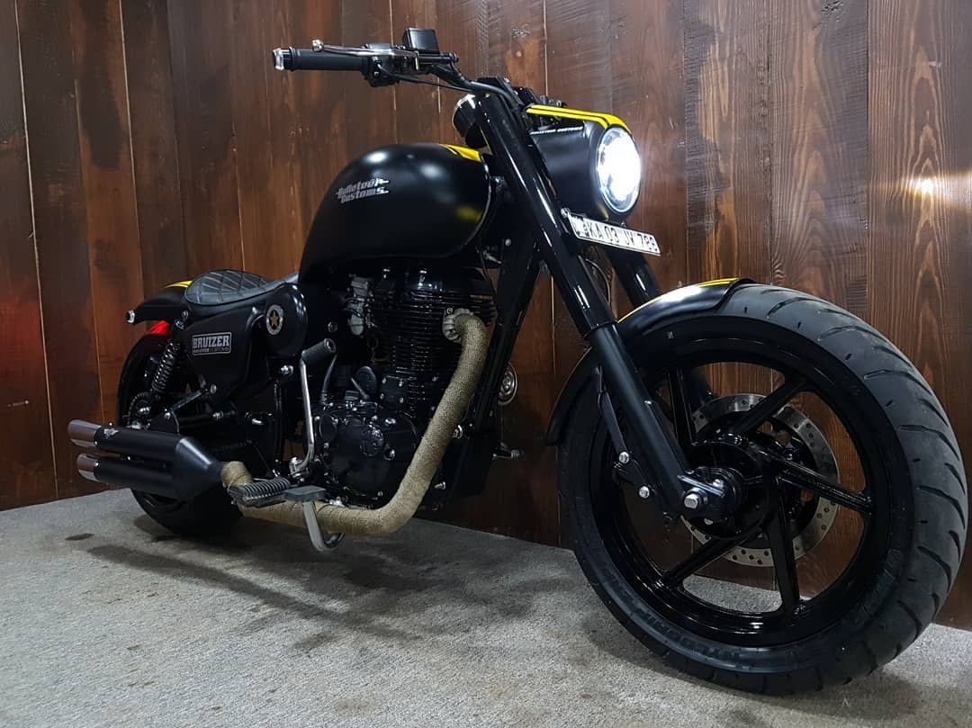 When everyone out there is either building a scrambler or a cafe racer, this customised Royal Enfield by Bulleteer Customs took a different route. Called the Leon, its matte black paint and that slammed appearance takes liking to the Harley-Davidson Night Rod. What with its one into two exhaust pipes and some yellow pinstriping, it adds a touch of sporty to what is powered by a long stroke motor.