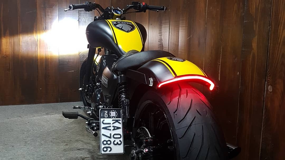 Some interesting details about this build include a curvaceous fuel tank, which drops down into the low saddle with grace and that taillight which follows the cure of the rear fender. The front forks and the rear springs have quite an aggressive rake angle and help the bike achieve its low-set appearance. Other bits include a fabricated nacelle which wraps itself around the LED headlight, an all-digital instrument console and black paint sprayed generously to achieve that night owl appeal. Custom wheels at both ends have been wrapped in fatter rubber and hauling duties have been handed over to disc brakes for both of them.