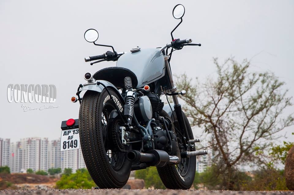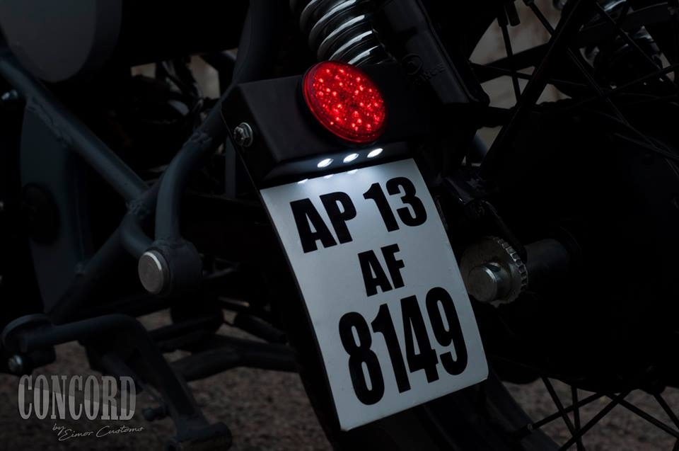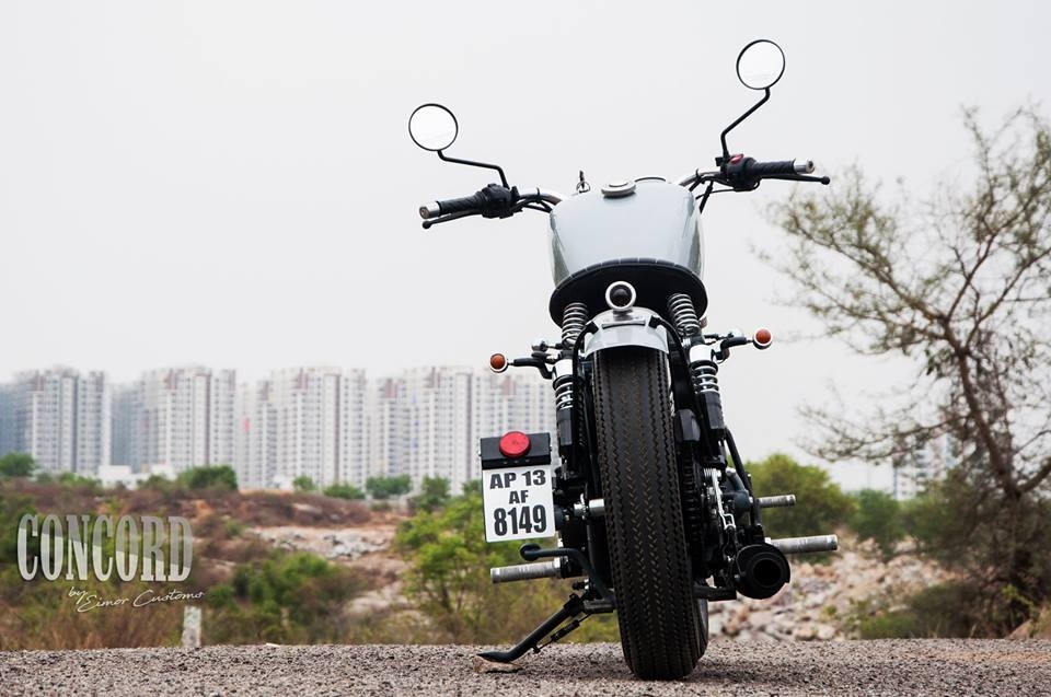 At the back, the single, spring-loaded saddle sits right above the twin rear shocks which carry out suspension duties for a rear tyre which is just as vintage as the front rubber. We like the side-mounted rear licence plate and the overall execution of the entire mod job. They call it the Concord.