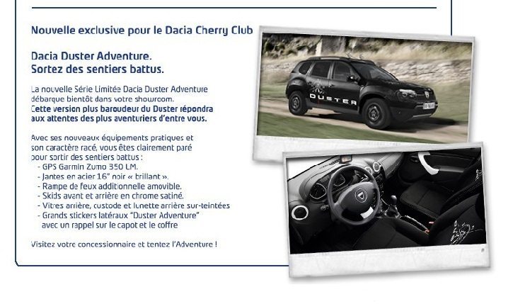 The Dacia Cherry Club is an exclusive club that publishes newsletters, holds events and provides offers to Duster customers.