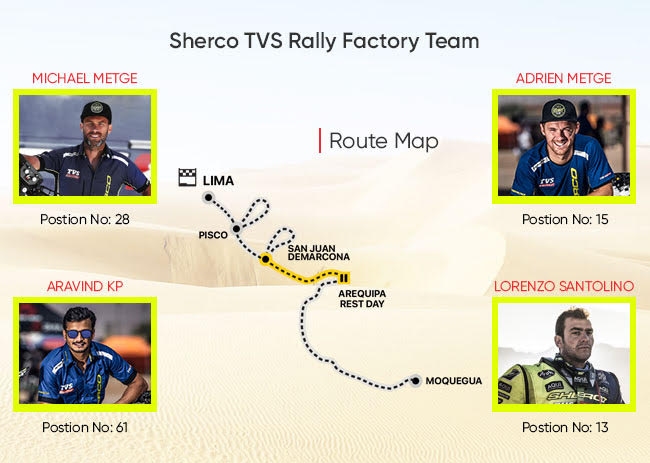 After all four bikes crossed the finish line post Stage 2, Team Sherco TVS Rally Factory’s two riders broke into the Top 20 at the end of stage 3. Battling heavy fog and extreme conditions, the four riders astride their RTR 450 rode from San Juan de Marcona into Arequipa after a grueling, 799 km stage, of which, 342 km was specials. Michael Metge bounced back strongly after losing time in stage 2 because of a fuel outage. He displayed some strong performance to finish the stage in the 13th position, taking his overall ranking to 28th. The riders will leave for Moquegua in stage 4, covering a total distance of 511 km, which includes 352 km of special.