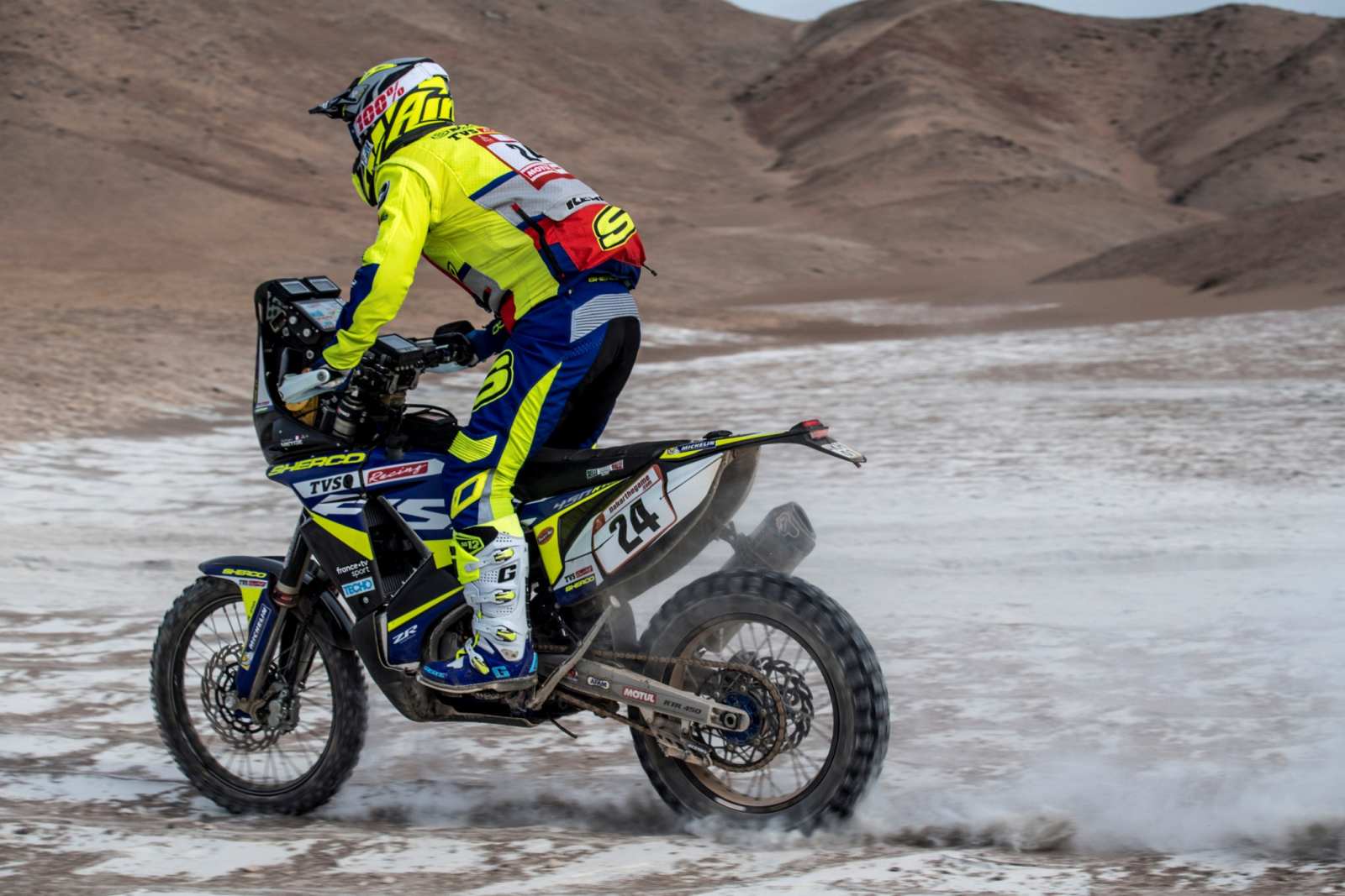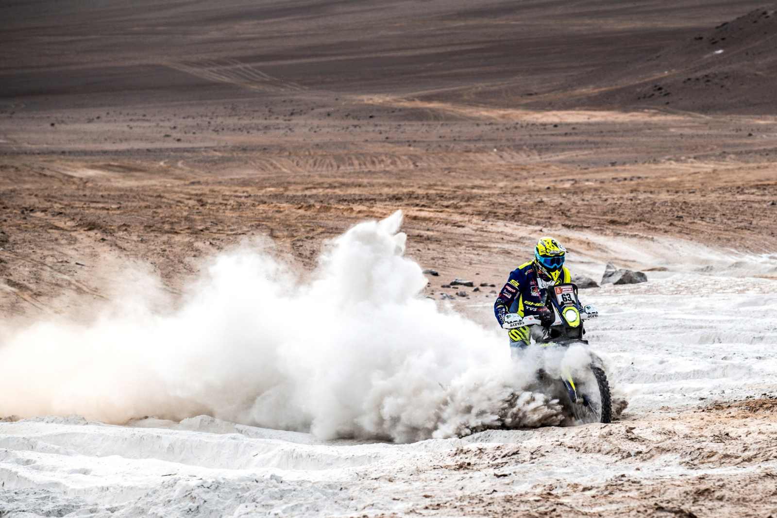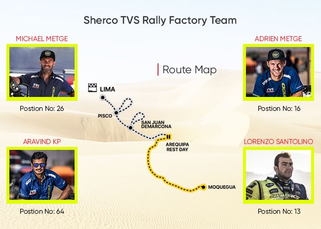After riding for 799 kms from San Juan de Marcona to Arequipa for stage 3, the Sherco TVS Rally Factory team and its four riders did well during Stage 4. The first of the two long marathon stages, where riders are on their own, without the help of their crew, Stage 4 stretched from Arequipa to Moquegua. It included 259 km of liaison and 405 km of specials. The riders will ride back to Arequipa in stage 5, covering a total distance of 776 km, which includes 345 km of special. This will be a marathon stage as well.