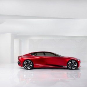 The design theme, termed “quantum continuum” reflects in both the exterior and interior materials surfaces of the car. In case you missed the detail, there is no B-pillar on the car. The doors are a complex structure and so is the rear high-mounted stoplight piercing the rear glass and then flowing down to help form the structure for the metal airfoil shape of the rear headrests.