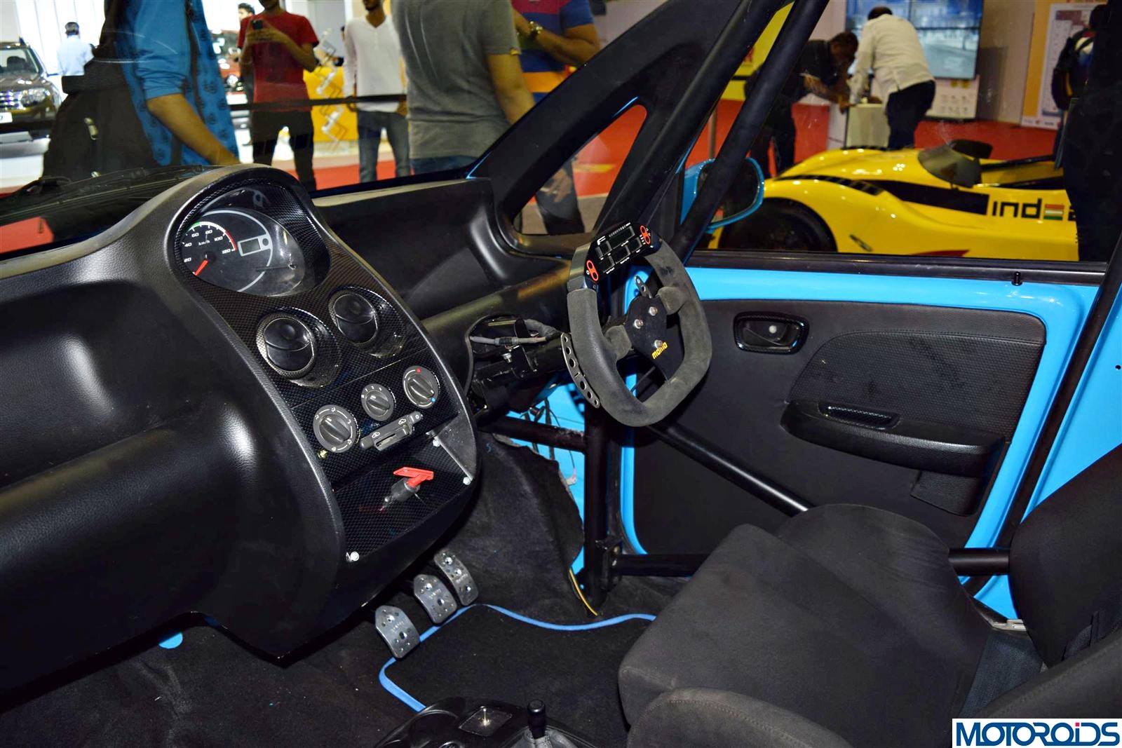 With an uprated suspension and braking system, the 230 bhp Tata Nano rides on four negatively cambered MRF Z.LO.s protruding out of the wide body kit. On the roll-caged interior is a pair of Recaro bucket seats, a race steering with paddle shifts working upon a six speed race transmission. Yummy specs!