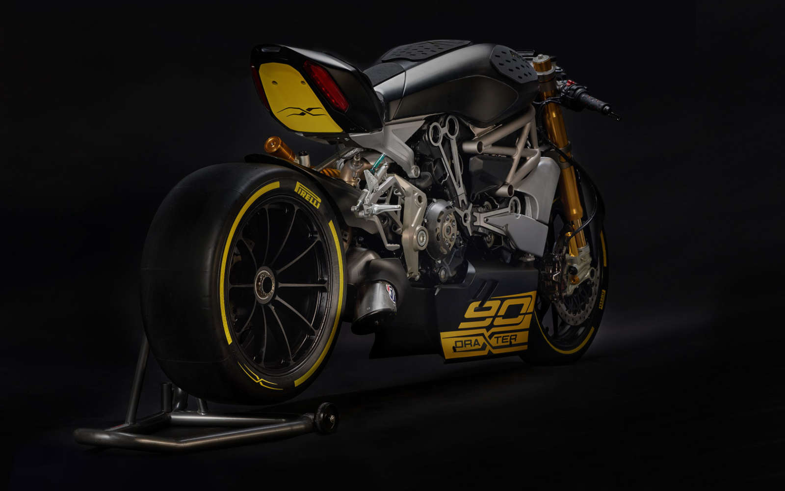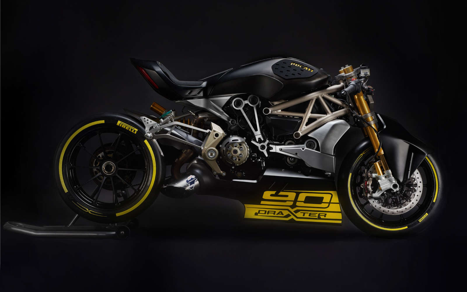 The number 90 on the side of the Ducati “draXter” recalls the racing world, yet also pays homage to Ducati’s 90th anniversary, being celebrated this year. The beating heart of the “draXter” is that of an dragster with racing componentry. The suspension and brakes have been taken directly from the 1299 Panigale Superbike. This styling exercise has accentuated the lines and proportions of the XDiavel making them more extreme than ever and turning the “draXter” into a unique, breath-taking supersport.