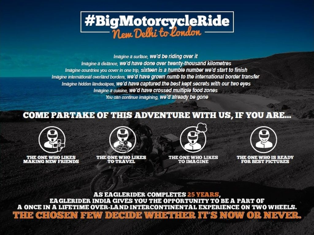 The folks at EagleRider India will soon embark on a 66-day journey from New Delhi to London. Known as the Big Motorcycle Ride, the Big Ride will have 16 riders traveling across 16 countries to celebrate 25 years of EagleRider internationally. On 15 June 2017, the ride will be flagged off from New Delhi. After a journey through China and Russia, the ride will reach its final destination, London, on 19 August 2017; riders will embark on an epic journey to London and back. The registrations for the Big Ride have already begun on the EagleRider India website.