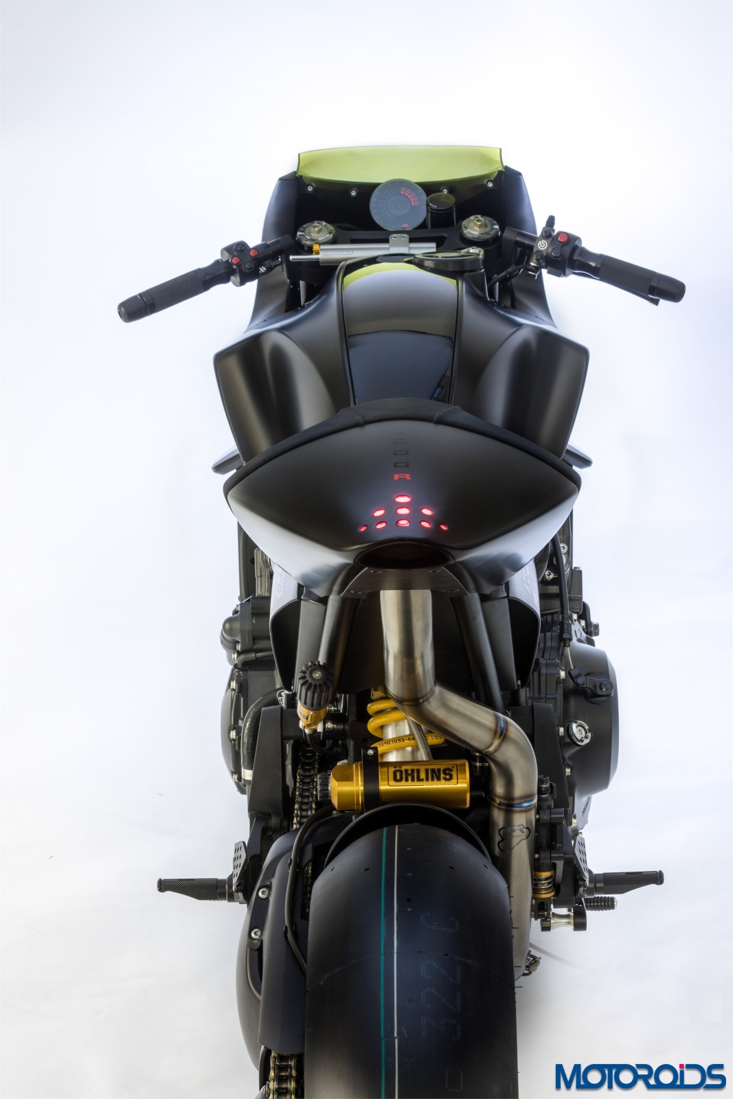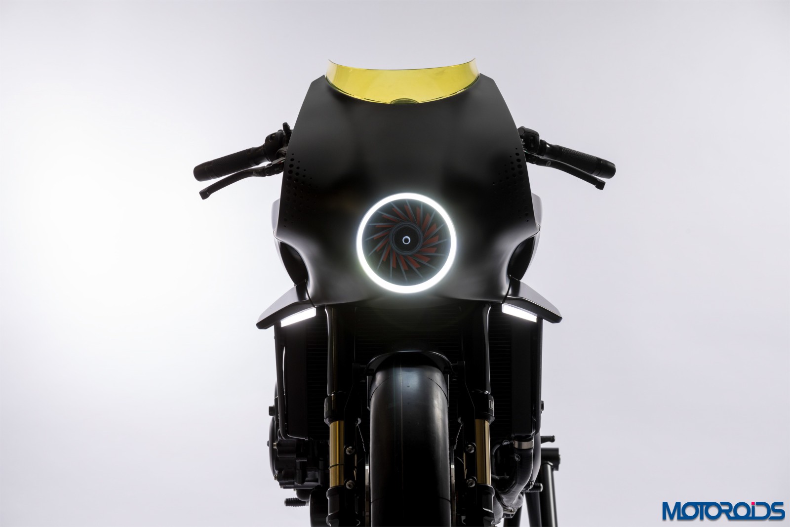The colour scheme is “total black”, combining elegance and sportiness while leaving room for a futuristic technology integrated into the flowing design lines. The front of the bike features a fan used to convert the motorcycle’s kinetic energy to power the touch-screen located on the tank. The screen provides constant connectivity, to allow the rider to follow the road through digital maps, make emergency calls or simply to connect devices.