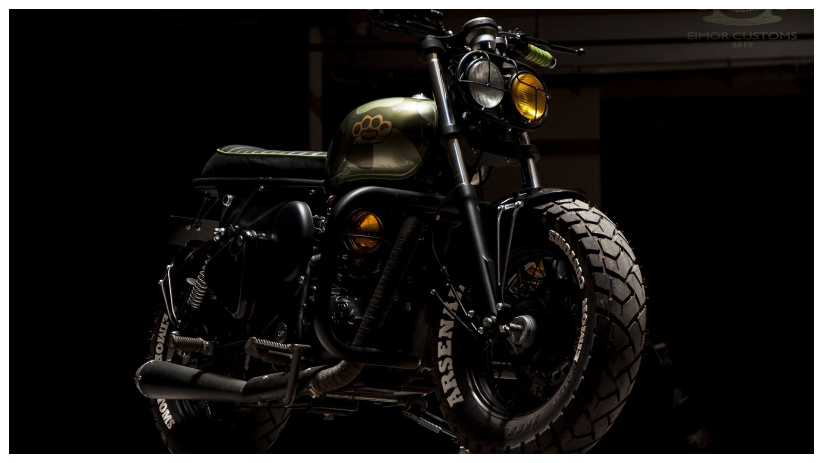 The Arsenal is truly a brute and aggressive looking build which looks tough to the core. The bike is completely based on the Classic 500 and gets no mechanical changes. In terms of design, the fascia gets a set of dual headlamps, one tinged in yellow, with a blackened grille for protection. The bike also gets a pair of gloss-black custom fenders and a customized black seat with green lining for a classy and retro look. The chunky tyres and exquisite paint job give the Classic 500 a completely different Scrambler look. All these design features come together to produce an irresistible bike.