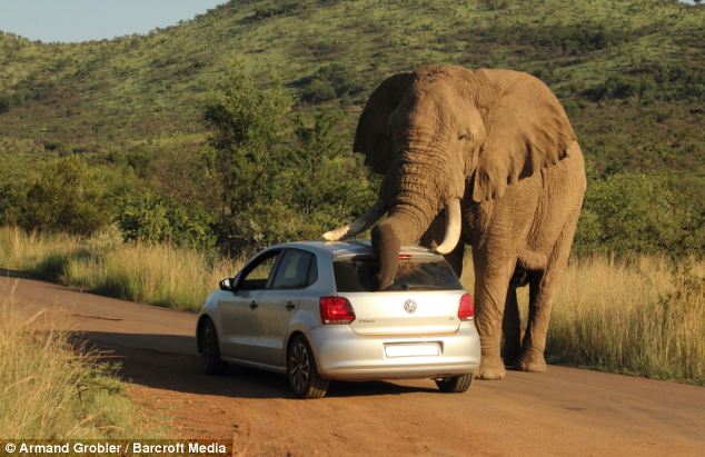 Elephants are usually considered to be aggressive creatures. But this particular bull elephant, which is likely to be in its musth (when its testosterone levels can reach 60 times greater than normal) seems to be getting playful with a Volkswagen Polo, itching itself using the car. However, the ride was not so playful to the occupants in the car who were hanging on to dear life throughout this horrific episode.