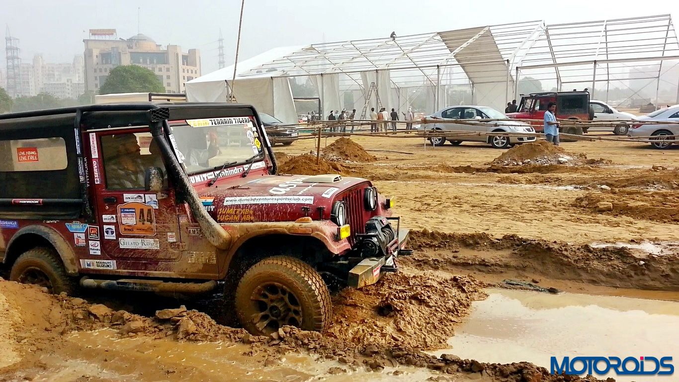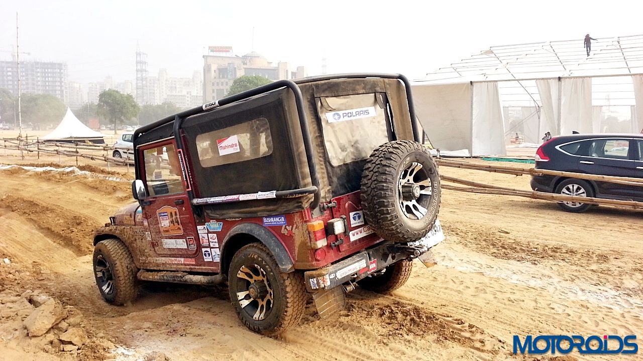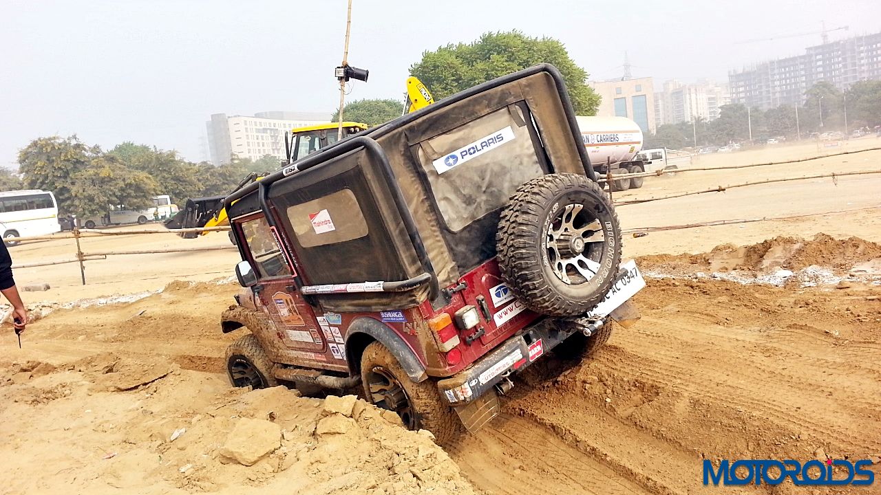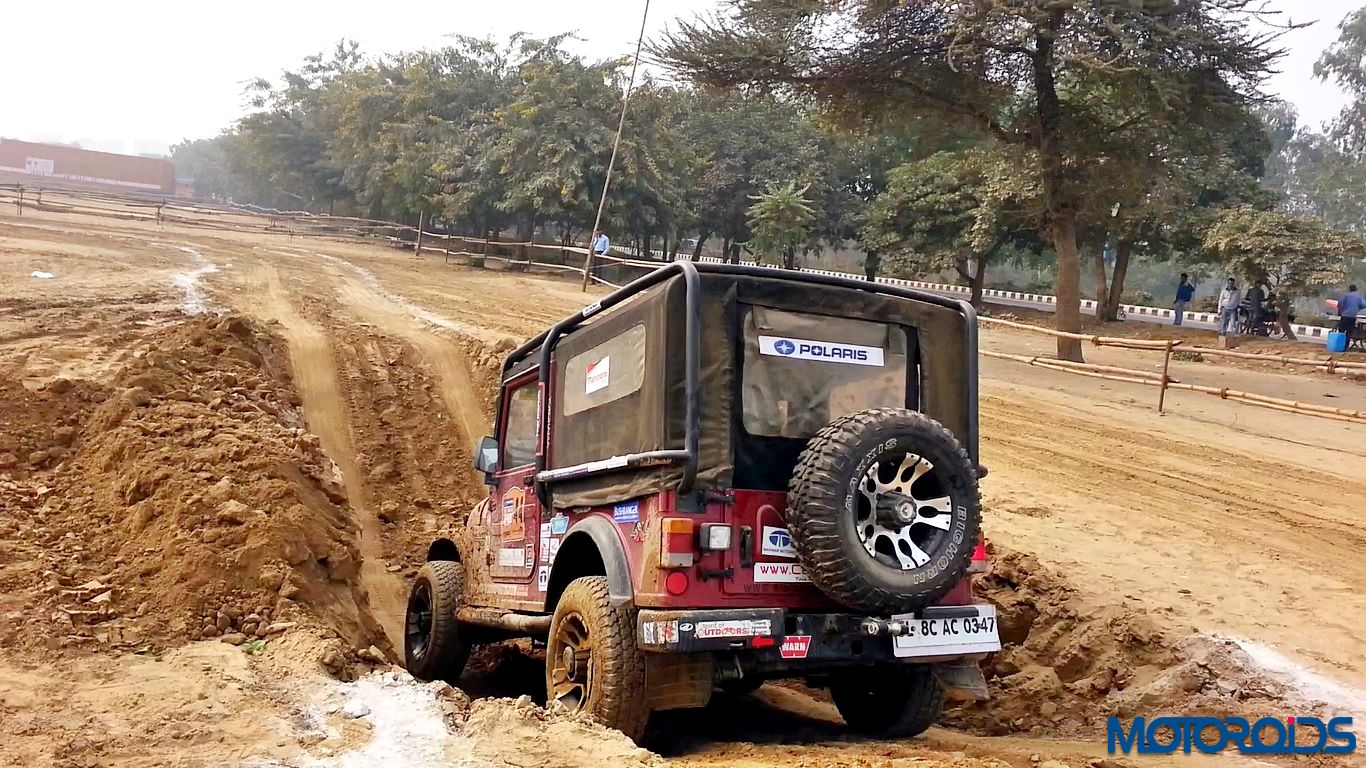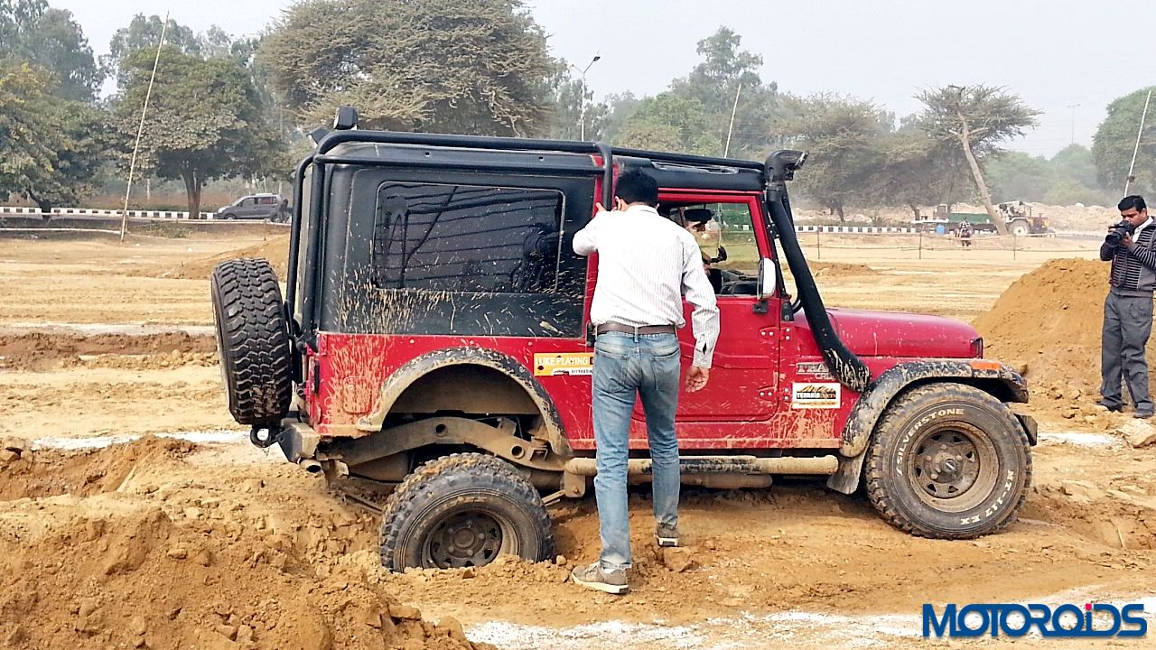 Now to the drive. We strapped ourselves up, made sure no lose objects were sliding around, put the transmission in Low Gear ratio and aligned the Thar between the two chalk lines. First we drove through the articulation section. The pits were deep and entire load came on one wheel. However, the DUAL Tread Compound and deep thread provided enough traction to pull the SUV out of the deep ruts. One thing common between off-roading and racing is that the line is extremely important. So we kept to the line and were out of the tough section easily. Wheels would spin with hard throttle but keep your right foot under control and the tyres would throw out the dirt and pull you out.
