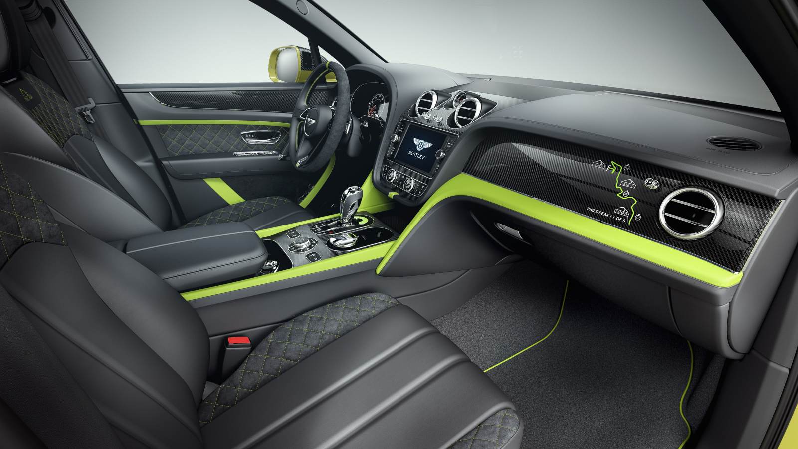 Inside, a Mulliner Design Colour Split marries Key Lime accents with Beluga leather, with Alcantara inserts to the seats and doors. The steering wheel and gear lever are also trimmed in Alcantara, and the headlining is technical Eliade cloth. A Pikes Peak logo decorates the carbon fibre fascias, and numbered Pikes Peak treadplates complete the interior.