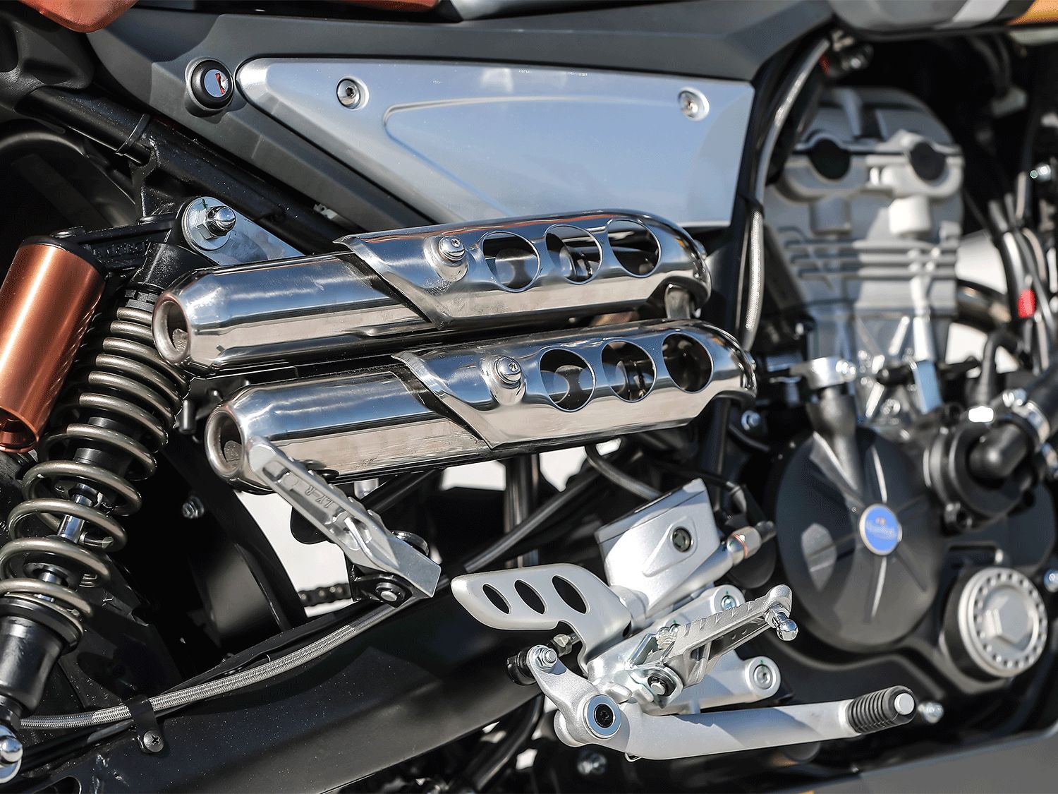 The 125cc version is equipped with a single-cylinder, liquid cooled engine, tuned to deliver 13.4 PS of maximum power @ 9,750 rpm and 10.5 Nm of peak torque @ 8,000 rpm. Other features include wire-spoke wheels wrapped in dual purpose tyres, upside down telescopic suspension upfront and double shock absorber at the rear, a flat handlebar with bar-end mirrors and disc brakes on both ends. On the left side are a pair of tall-set Scrambler motorcycle style exhaust pipes.