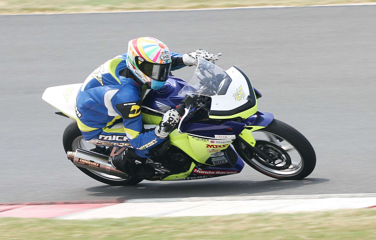 The action resumed with the CBR 250R with India’s two top riders Sarath Kumar & Rajini Krishnan going head-to-head once again. Last time out in Chennai both collided and it looked like it might happen again but both riders put on a scintillating performance to show their class. Sarath, who started on pole, led off the line followed by Abhishek V and Rajini. Rajini soon passed Abhishek and had a race long battle with Sarath. At the start of the last lap it looked like Sarath had done enough but Rajini came hard at him and they were side-by-side coming into the fast corner. Rajini dived down the inside of Sarath and made the move stick and crossed the line in first place ahead of Sarath. Abhishek V finished in the third place.
