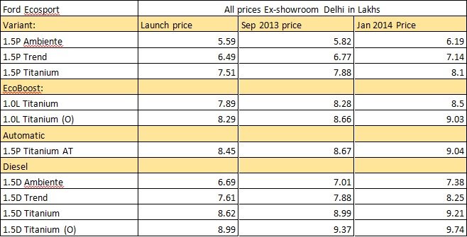Some very basic calculations reveal that the EcoSport has got dearer by up to INR 75000 in last 6 months! The Ford EcoSport price rise across all variants is around INR 64,000. The increase in prices makes the EcoSport all the more closer to the XUV500, prices of which now start at INR 10.95 lakhs for the newly introduced W4 variant.