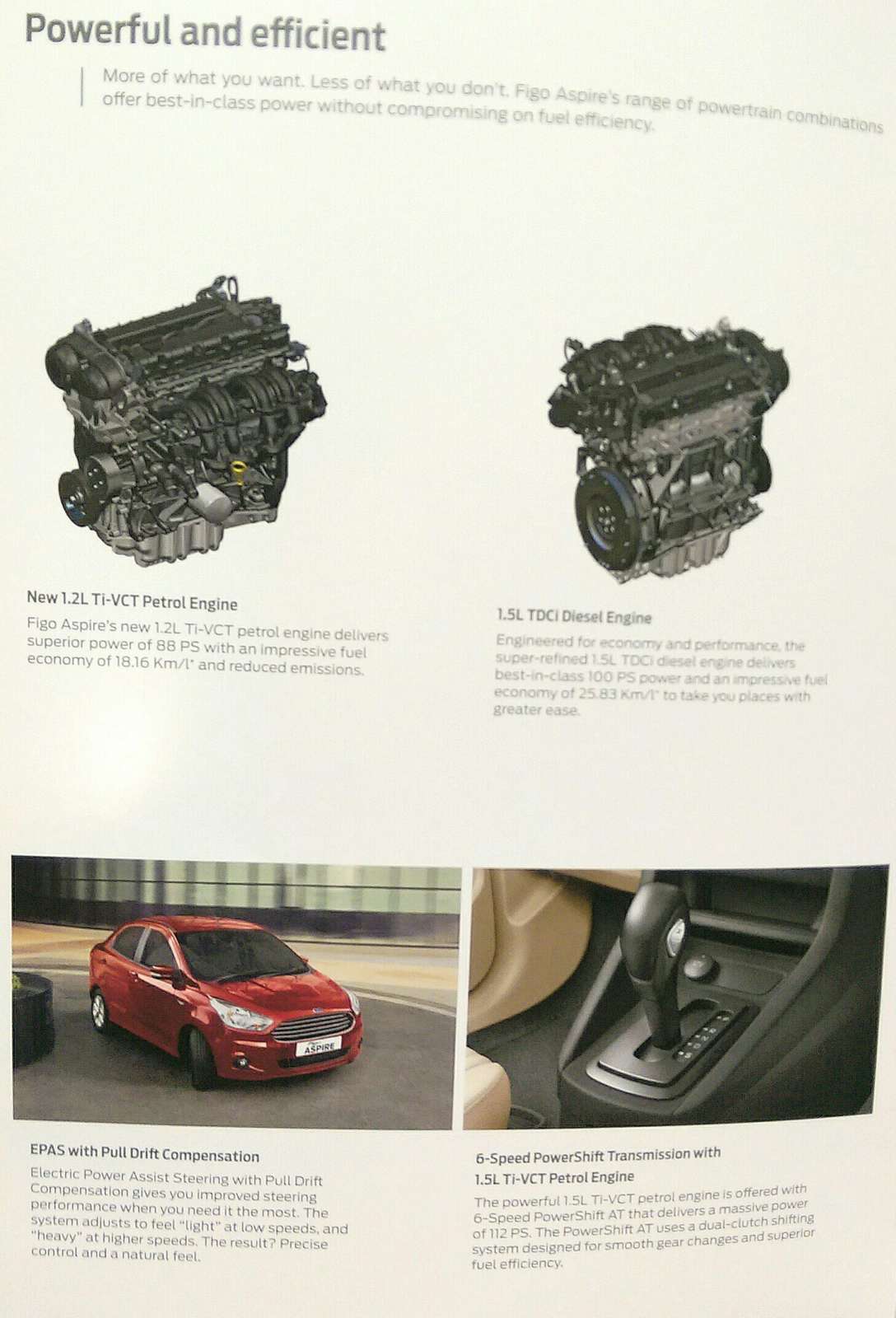 Ford India has introduced the Figo Aspire with three engine and two transmission options; the former includes an 88 PS 1.2-litre Ti-VCT petrol, a 112 PS 1.5-litre Ti-VCT petrol, and a 1.5-litre Duratorq diesel engine that makes 100 PS of power. These engines are rated at 18.16, 17 and 25.83 km/l by ARAI in terms of fuel efficiency, respectively. Transmission options include a 5-speed manual on the 88 PS petrol and 100 PS diesel-fuelled Figo Aspire; the top-spec 112 PS petrol car gets Ford’s dual-clutch 6-speed ‘PowerShift’ gearbox.