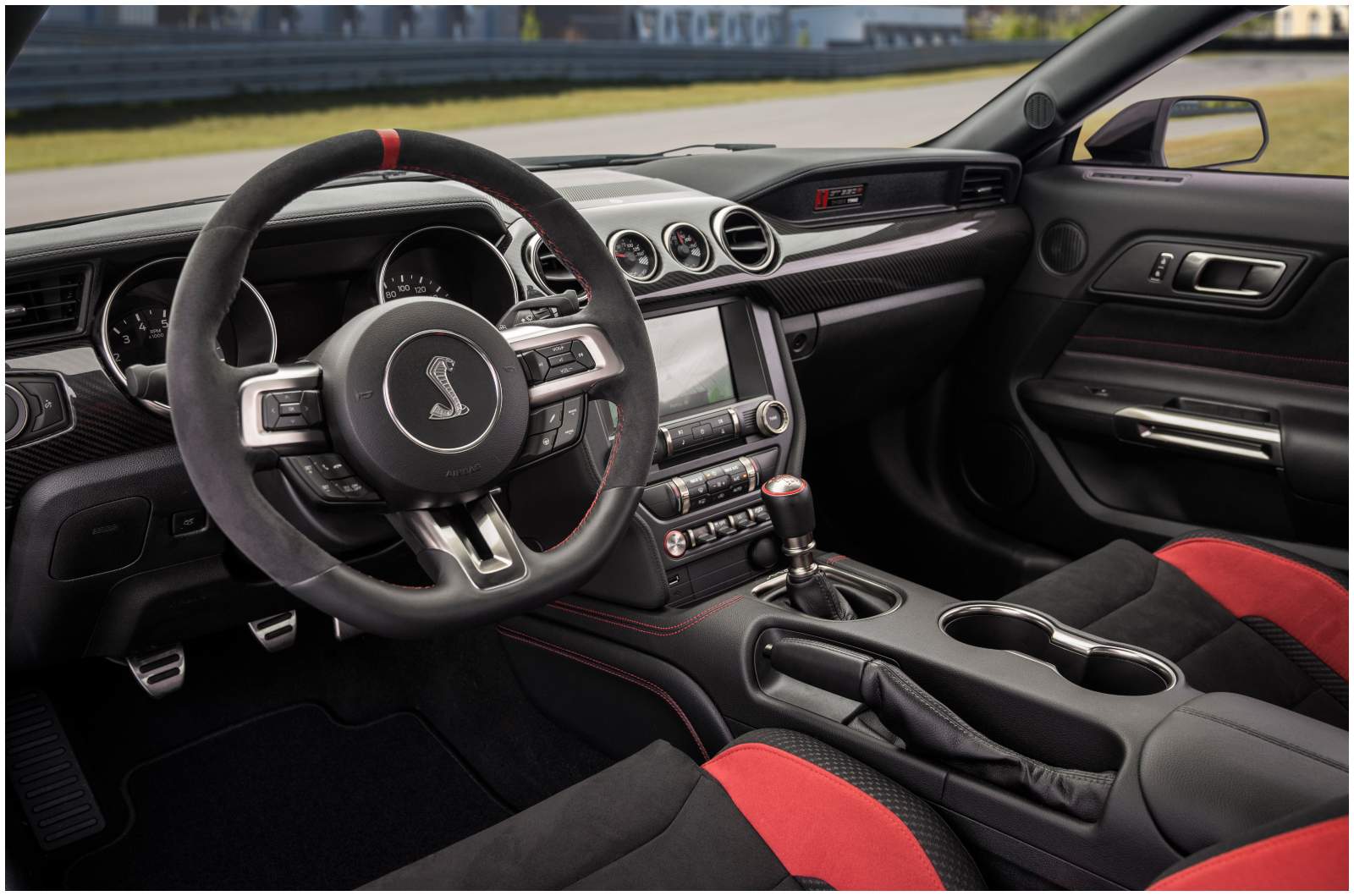 In terms of Interior, Ford also offers the GT350R with a Technology Package with a 12-speaker B&O premium sound system, Blind Spot Information System with Cross-Traffic Alert, Cobra Puddle Lamps and voice-activated navigation. The car also gets high-contrast red stitching, a Shelby GT350R badging and the D-shaped steering wheel fitted with a red centre mark at the top. Talking about the exterior, the car gets a new set of red-painted brake callipers and red pin striping at the edges of the optional over-the-top racing stripes and Shelby GT350R badging.