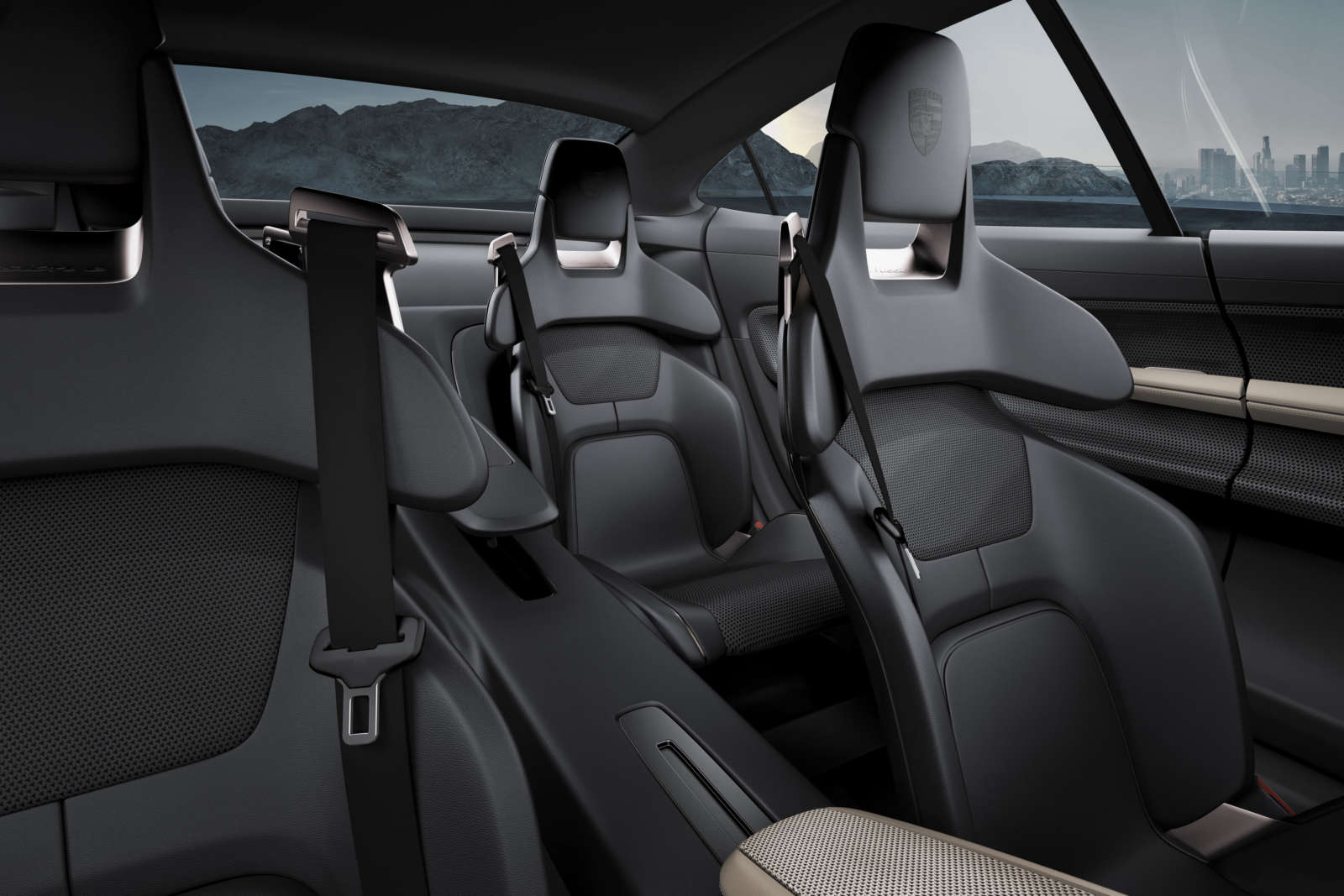 The rear design is typically Porsche, and imbibes a raked rear windscreen, which draws inward at the rear, creating space for the sculpted shape of the rear haunches. A three-dimensional “PORSCHE” badge illuminated from inside hovers beneath an arch of light that extends across the entire width in a black glass element.