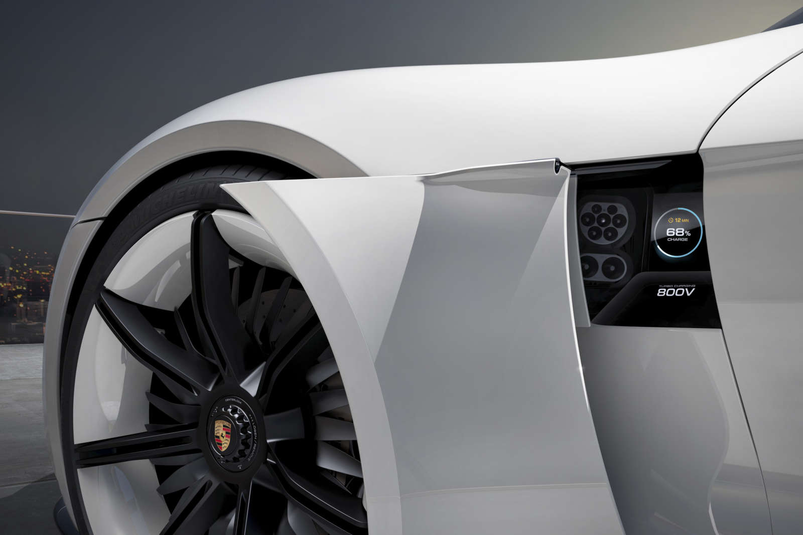 Being a Porsche, the Mission E features optimal weight distribution and a low centre of gravity. The battery mounted in the car’s underbody, which is based on the latest lithium-ion technology, runs the whole length between the front and rear axles. The body as a whole is made up of a functional mix of aluminium, steel and carbon fibre reinforced polymer. The wheels are made of carbon: the Mission E has wide tyres mounted on 21-inch wheels in front and 22-inch wheels at the rear.
